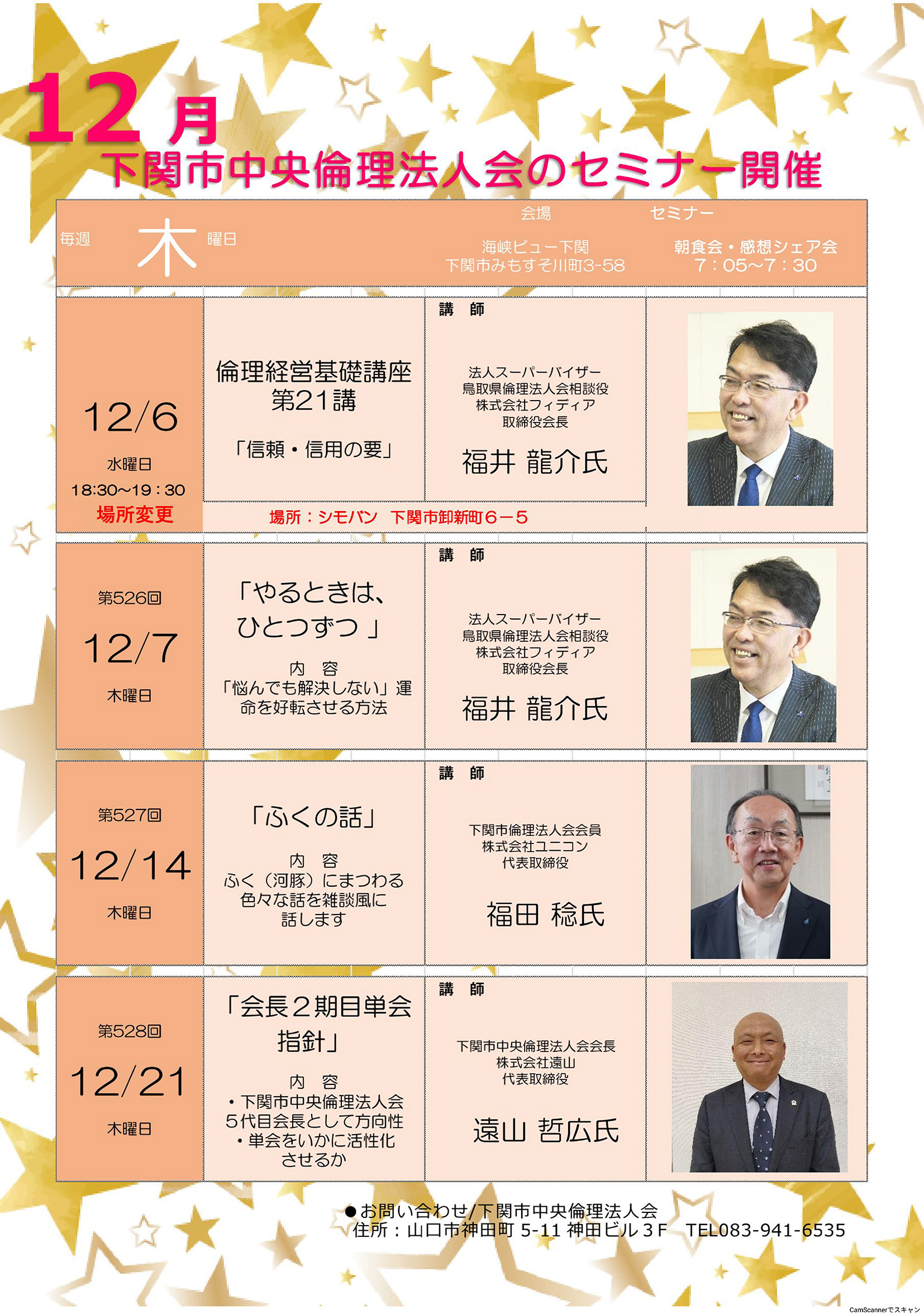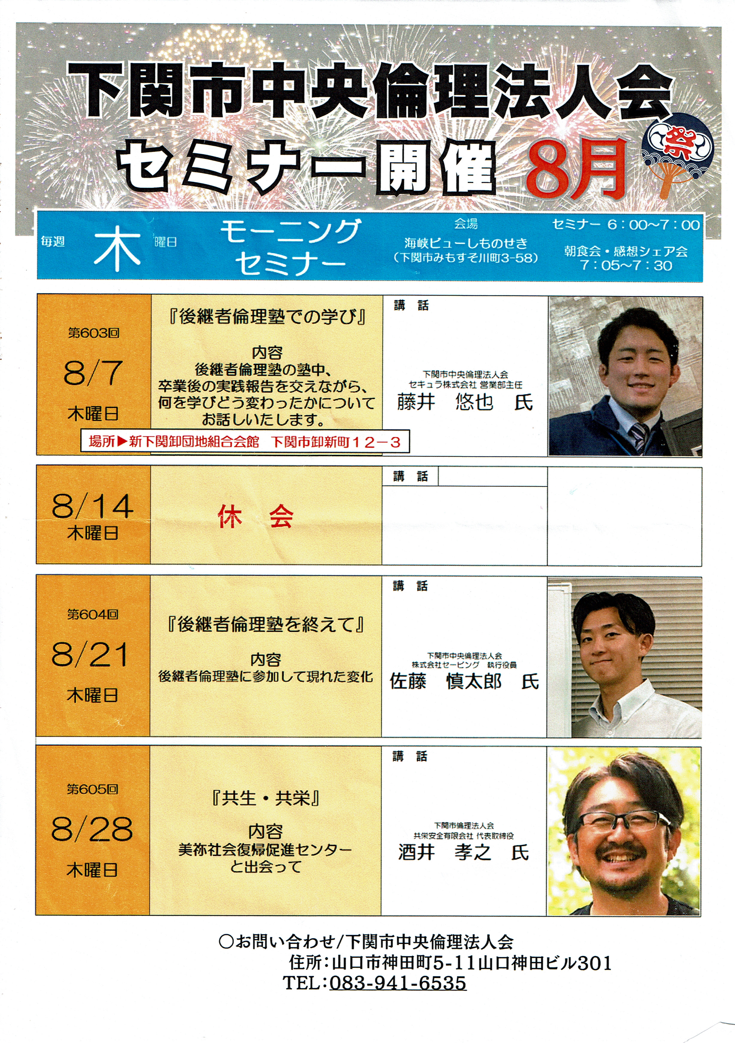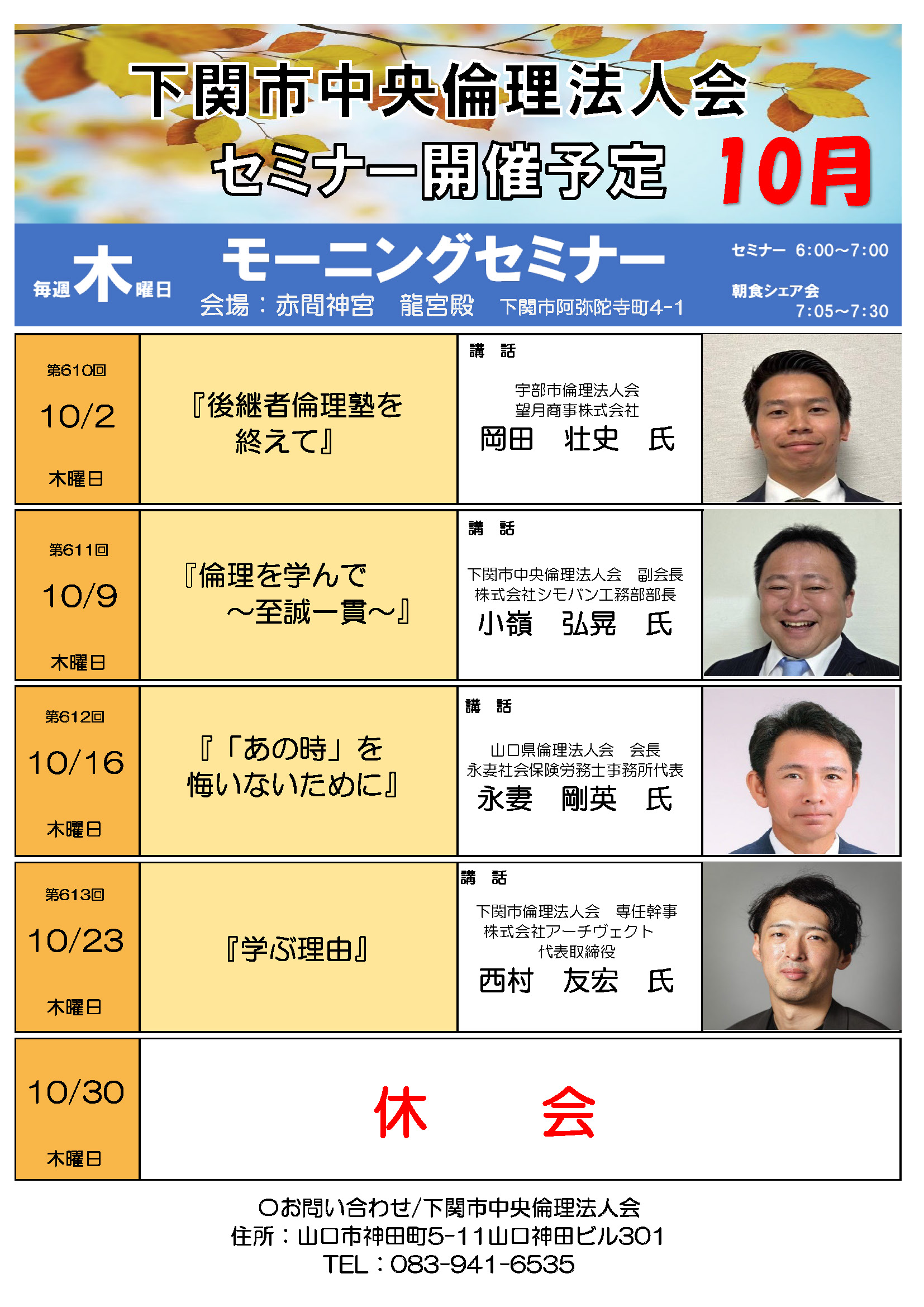 水上 隆男氏(山陽小野田市準倫理法人会会長有限会社みつや・トロアメゾン代表取締役)にご登壇していただく予定です。またのご参加をお待ちしております。