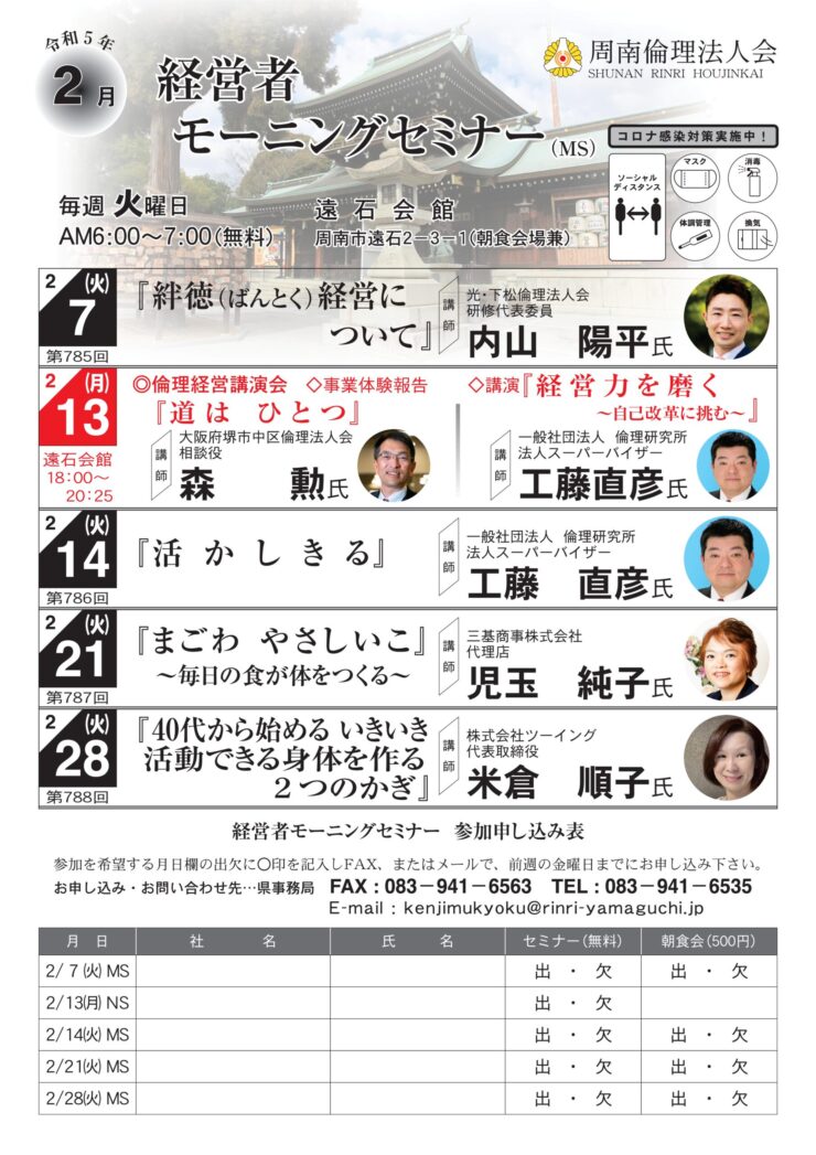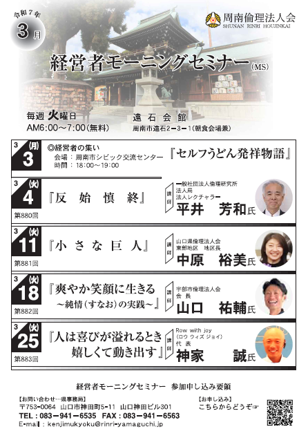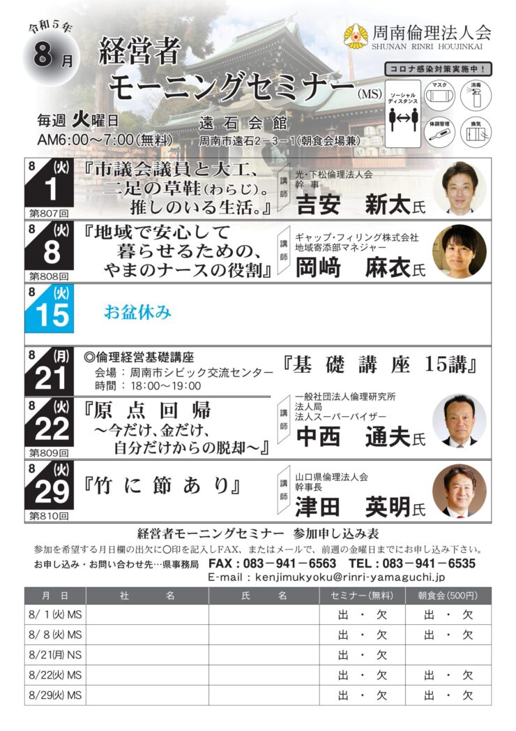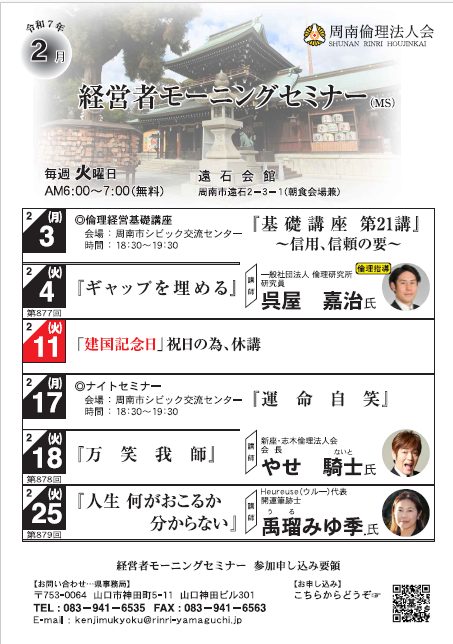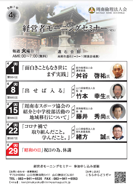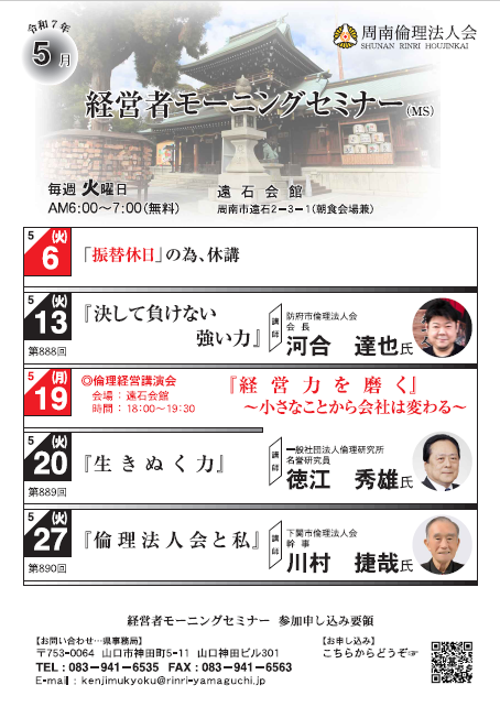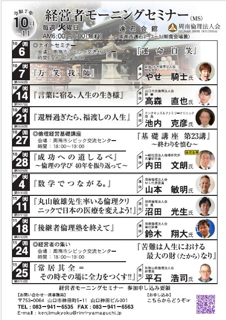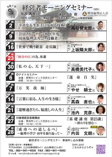 | お問合せ | 山口県倫理法人会 事務局 TEL:083-941-6535 FAX:083-941-6563 |