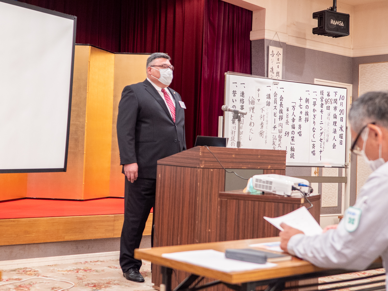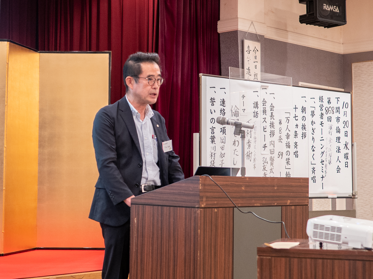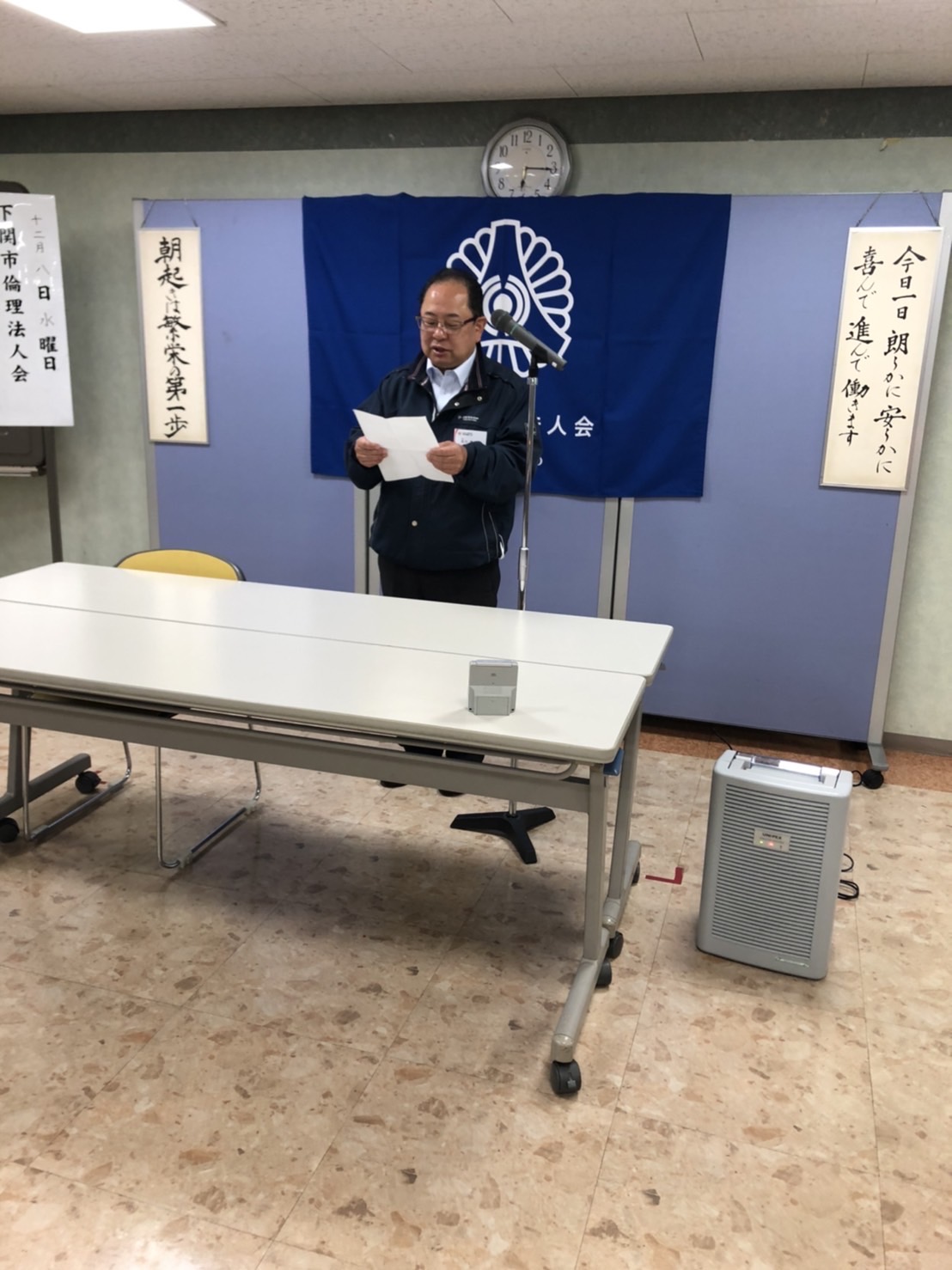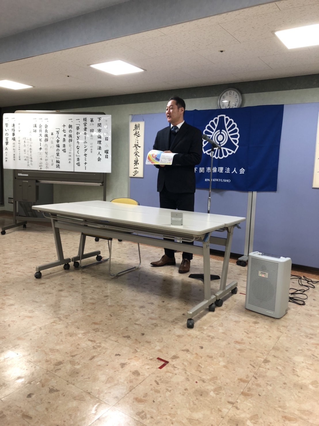 下関市倫理法人会 幹事 下村 秀樹氏をお迎えし、「倫理とわたし」についての講話を拝聴しました。