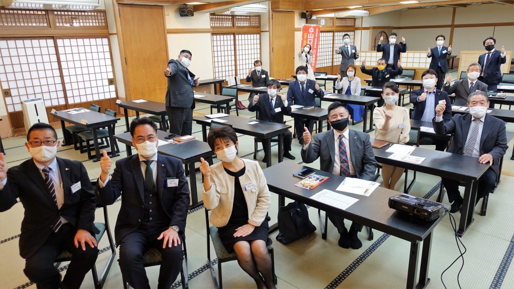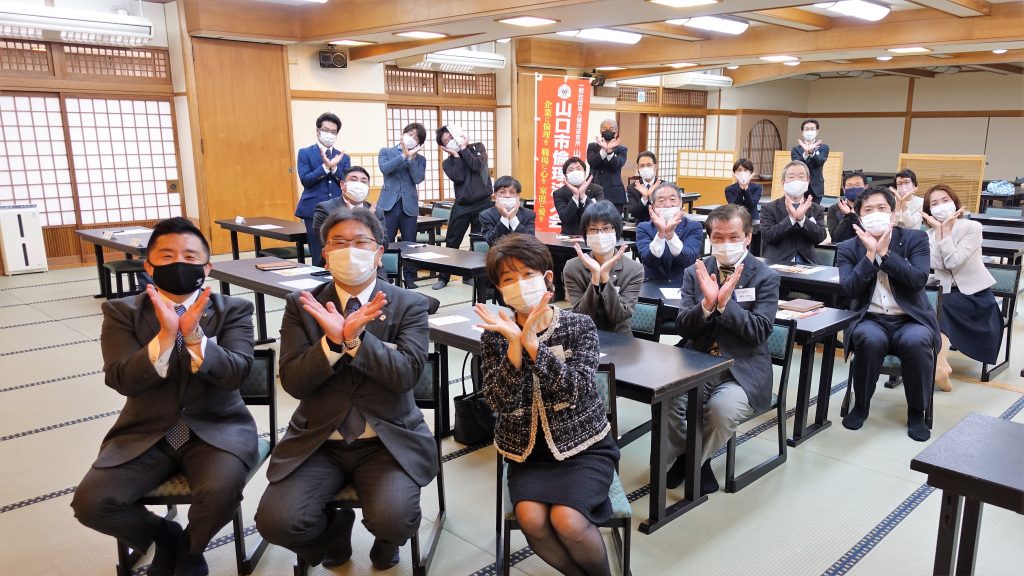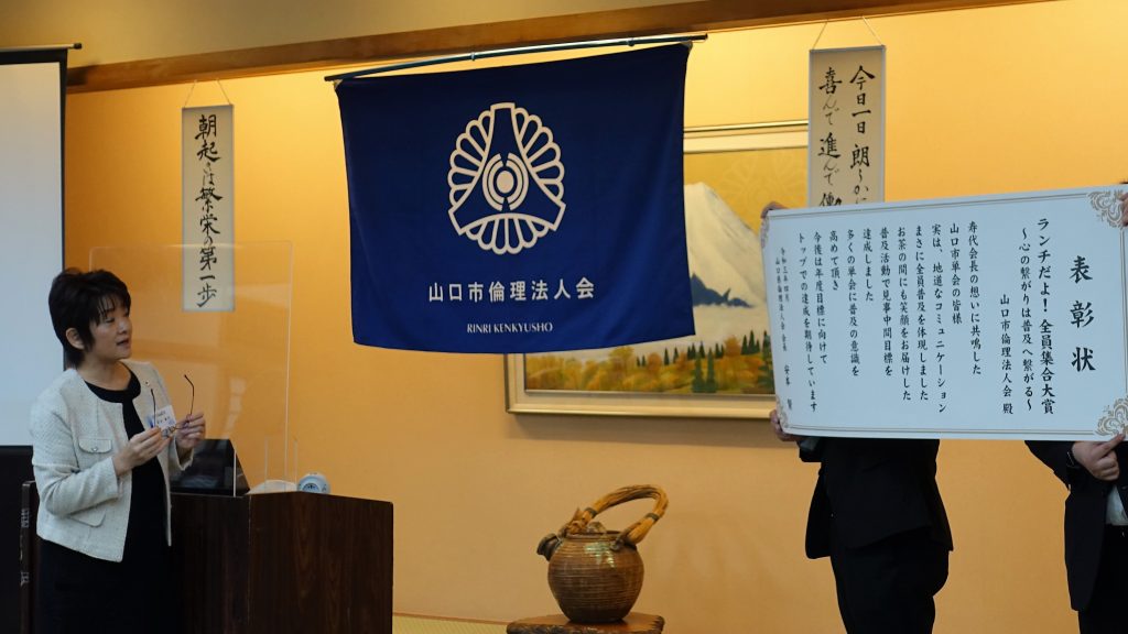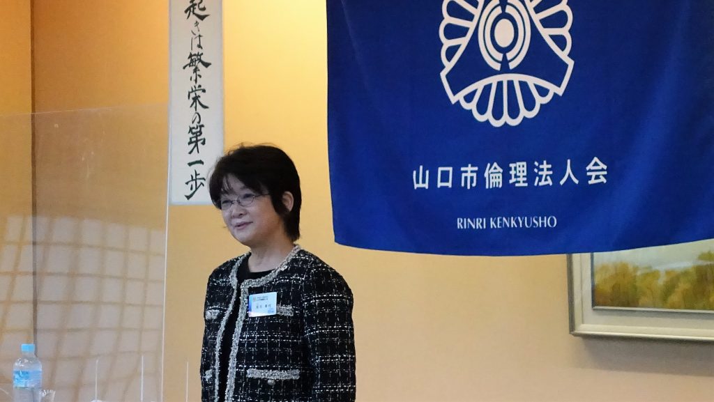 会長挨拶:安元寿代会長: 入会セレモニー後、先週開催された山口中央倫理経営講演会の会長挨拶、女性委員会主催の美しく輝きたいあなたへで、女性委員長参4人の会員スピーチが素晴らしく感動したことについて。