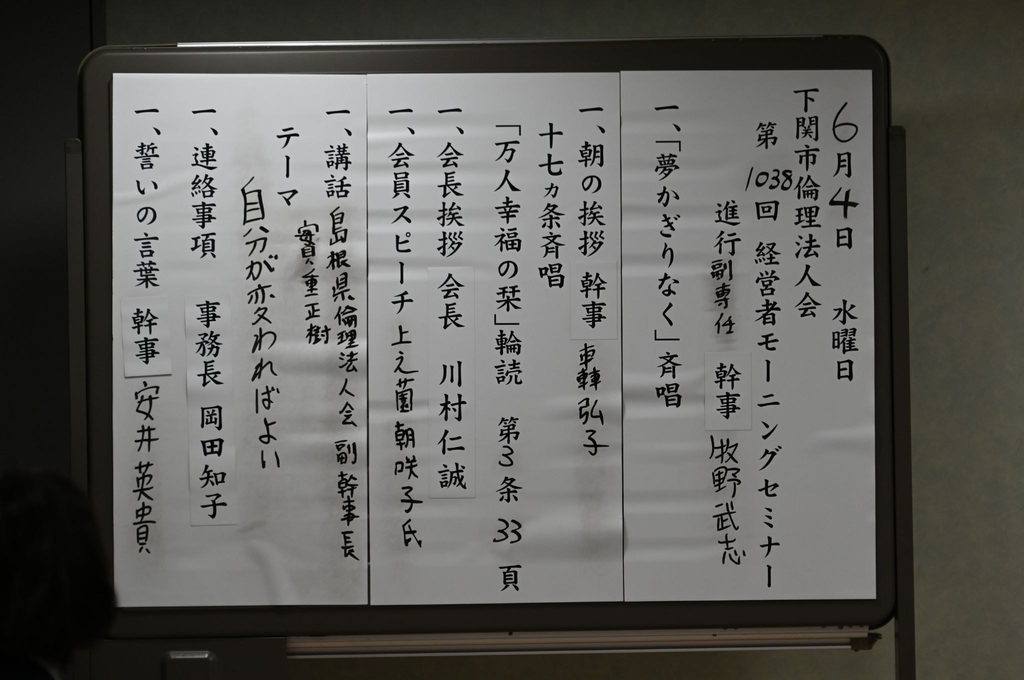 また、講和の代わりに、新会長の川村仁誠氏が決意と目標を語り、1001回という節目にふさわしいすがすがしい決意が全員で共有されました。
