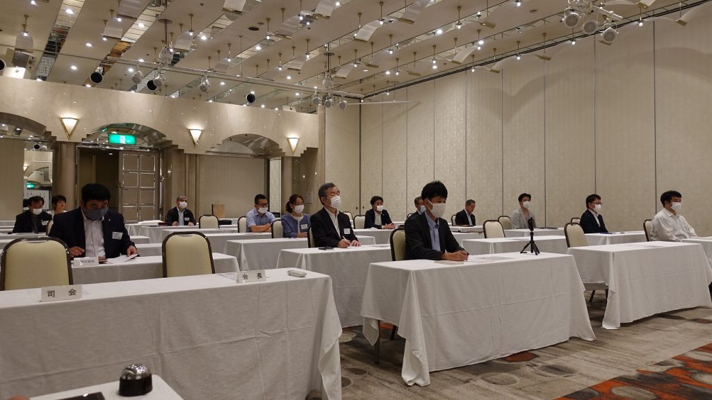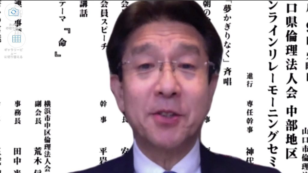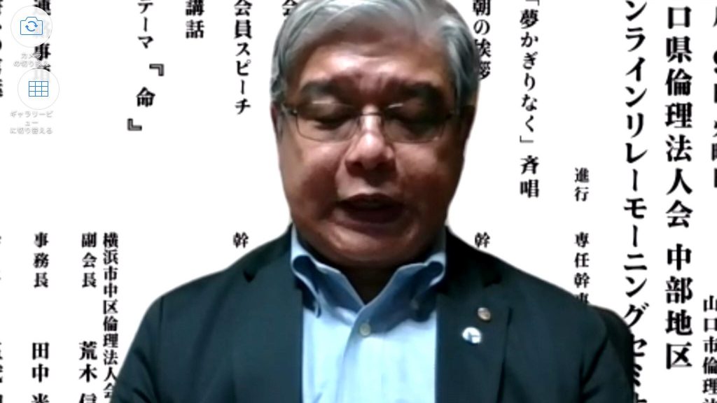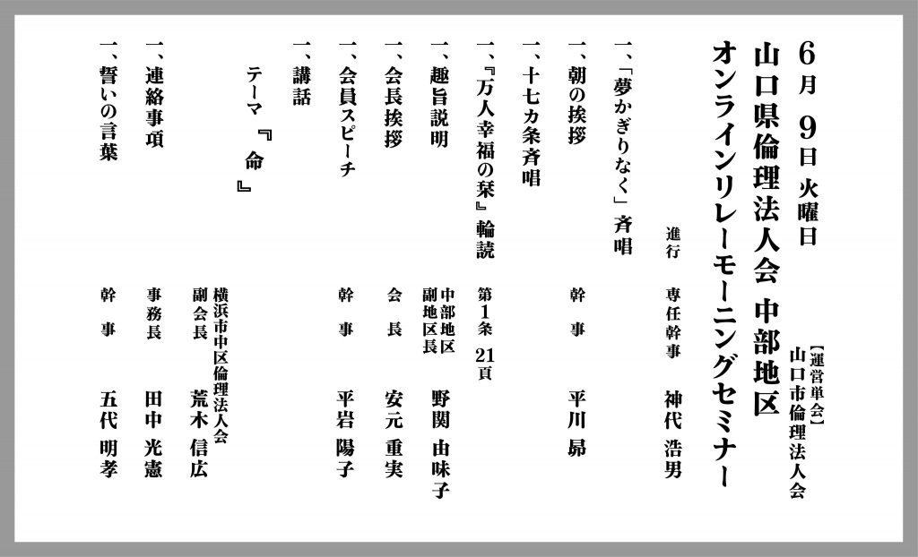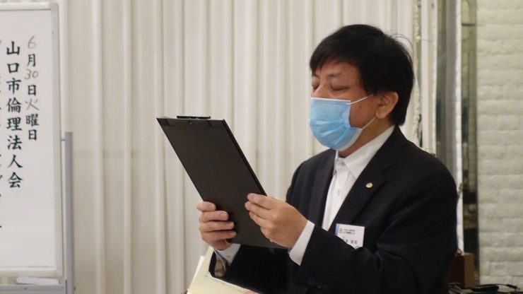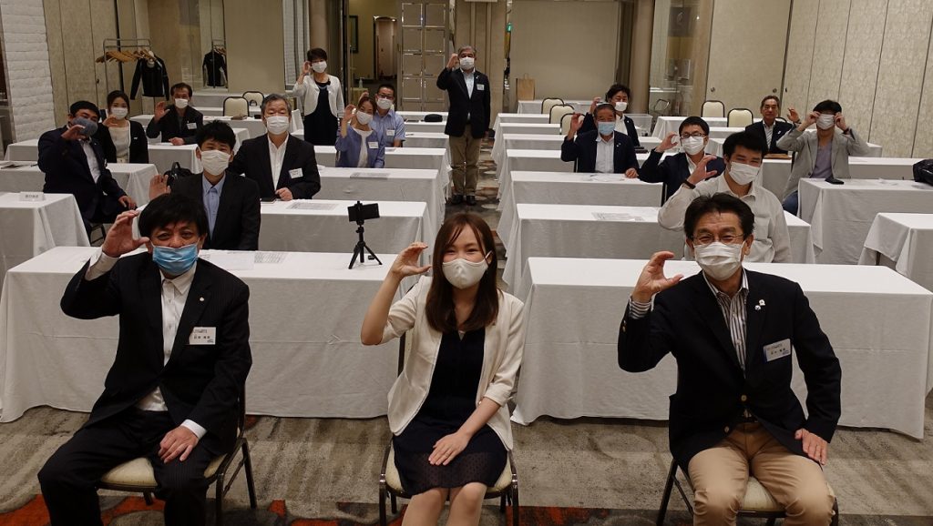 山口県倫理法人会作成の「モーニングセミナーガイドライン 役職様へ」に沿って、会場の換気、受付での検温と手指のアルコール消毒、全員のマスク着用、着席間隔を空ける、終了後に備品(机・イス・時計など)や机上に配置するラミネート資料他のアルコール消毒(ニトリルグローブ・使い捨てレーヨンタオル使用)などを行い、緊張感と久しぶりに顔を合わせる嬉しさの中、ベルの音が鳴り始めました。