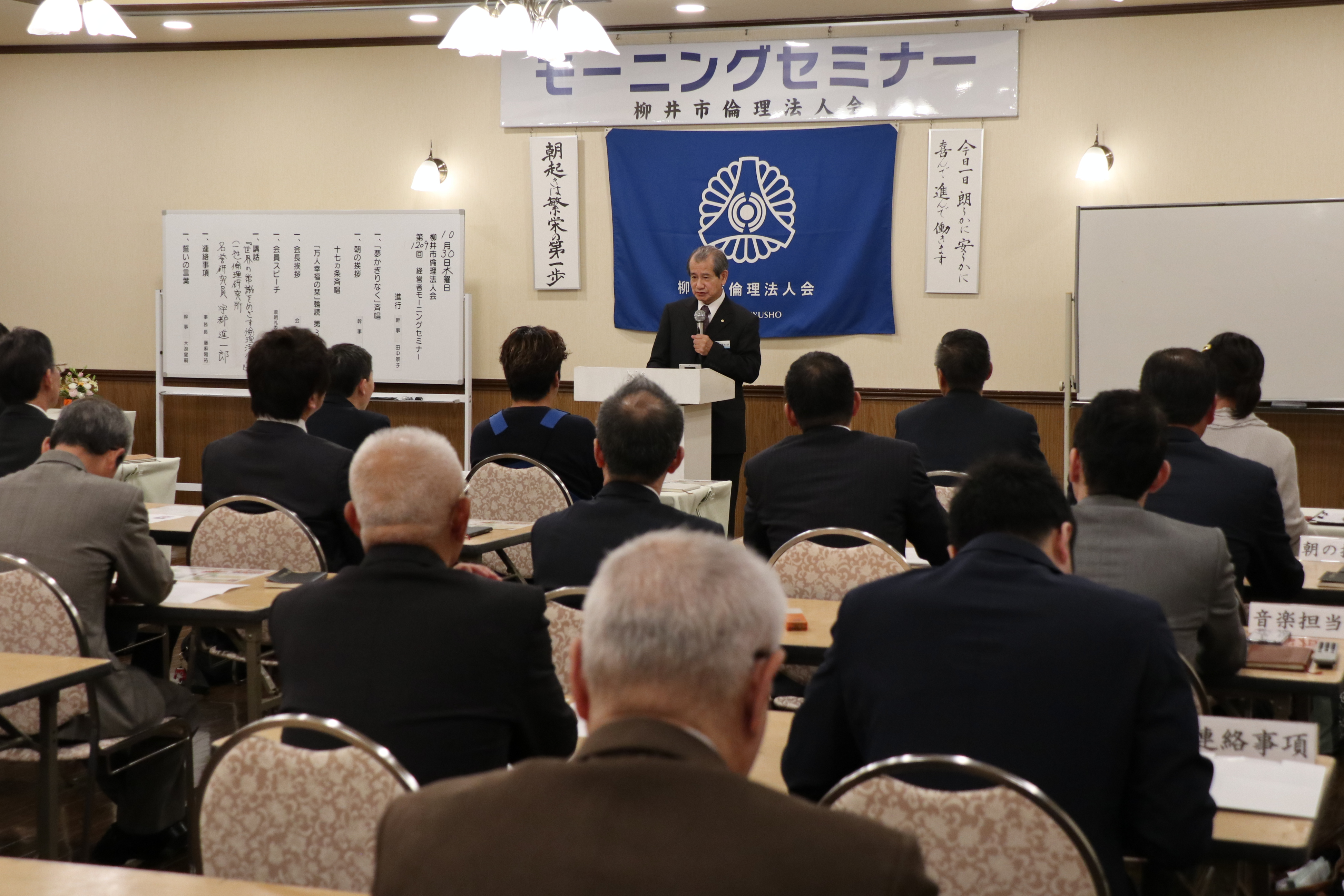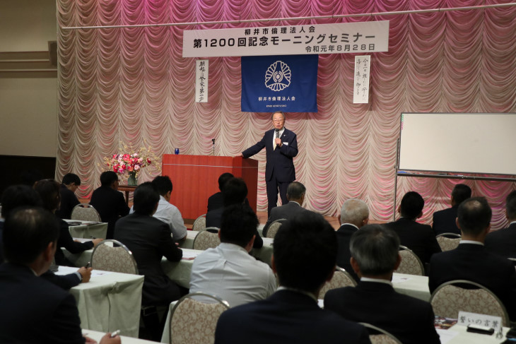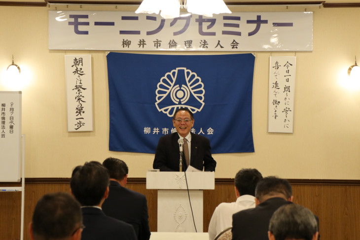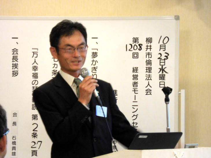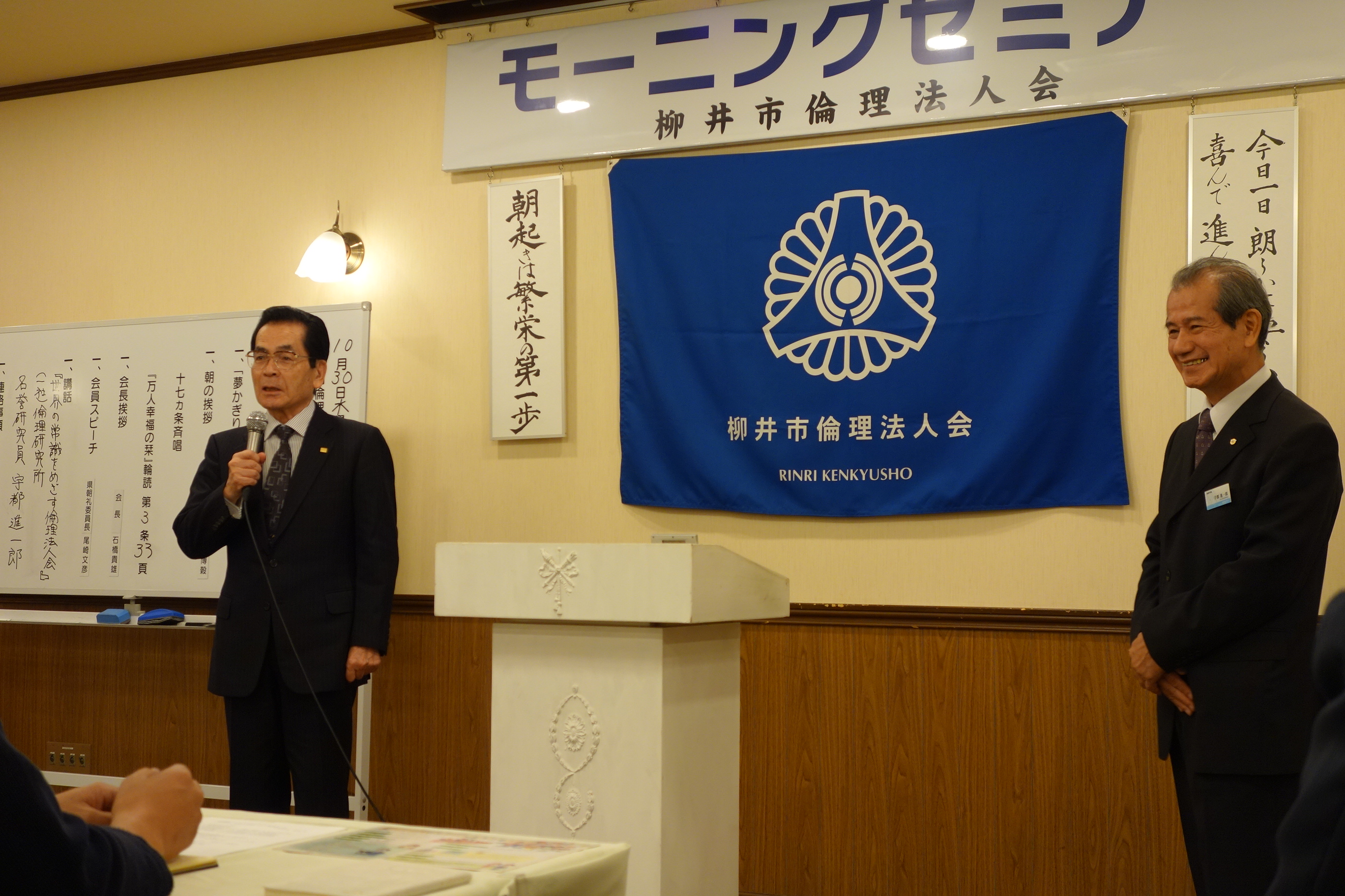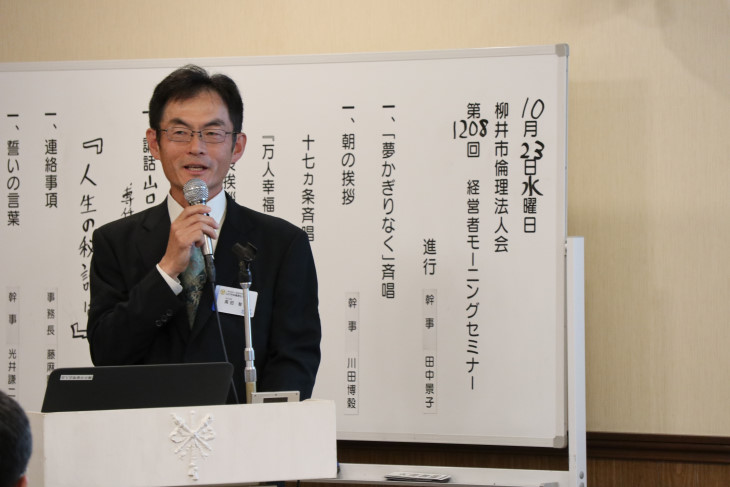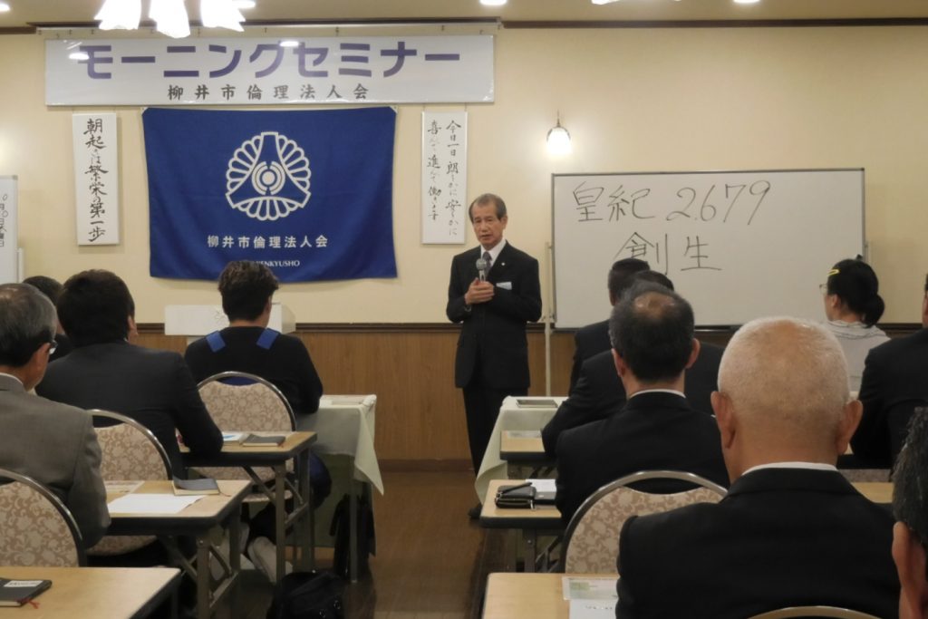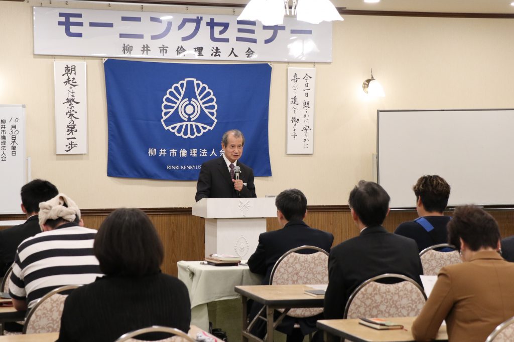 令和元年10月30日第1209回柳井市倫理法人会経営者モーニングセミナーは、(一社)倫理研究所 宇都 進一郎 名誉研究員をお招きし「世界の常識をめざす倫理法人会」をテーマにお話いただきました。宇都氏は倫理法人会立ち上げから倫理法人会に携わってこられて、50年になられるそうです。立ち上げや全国に拡げていく課程での苦労や喜び、柳井市倫理法人会の開設時の思い出などお話下さいました。また、今回のテーマについては、日本文化は、東洋や西洋など外国から伝わった文化や宗教などに日本独自の文化が融合して出来ていて、2600年以上継続している。純粋倫理は日本文化として世界に伝えていき、世界からいただいた恩に恩返ししていかなければならないとお聞きし、倫理の学びのすばらしさと共に、使命に背筋がピンと伸びる気がしたモーニングセミナーでした。