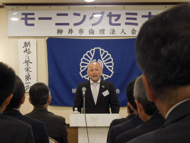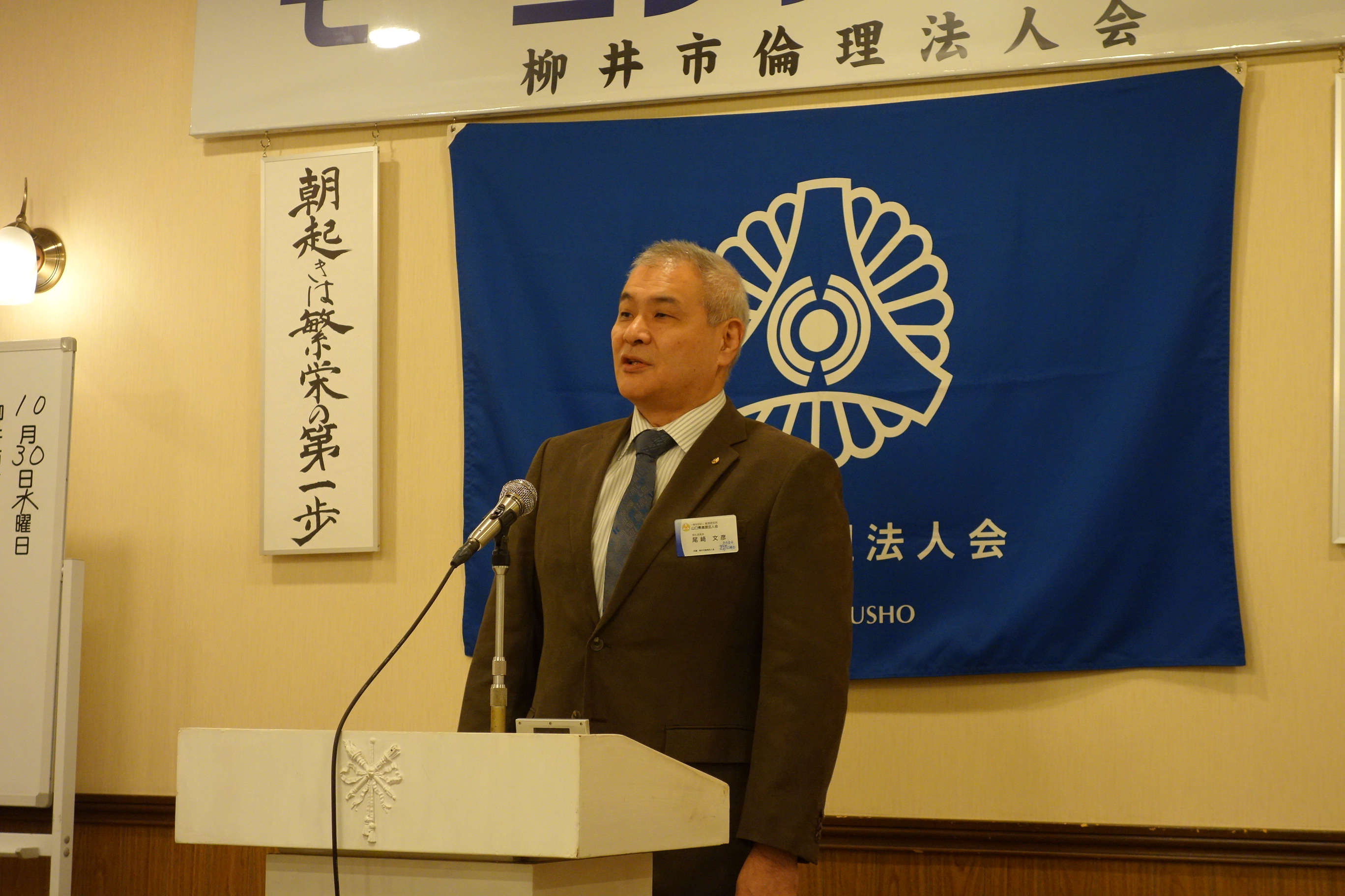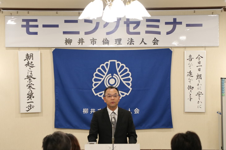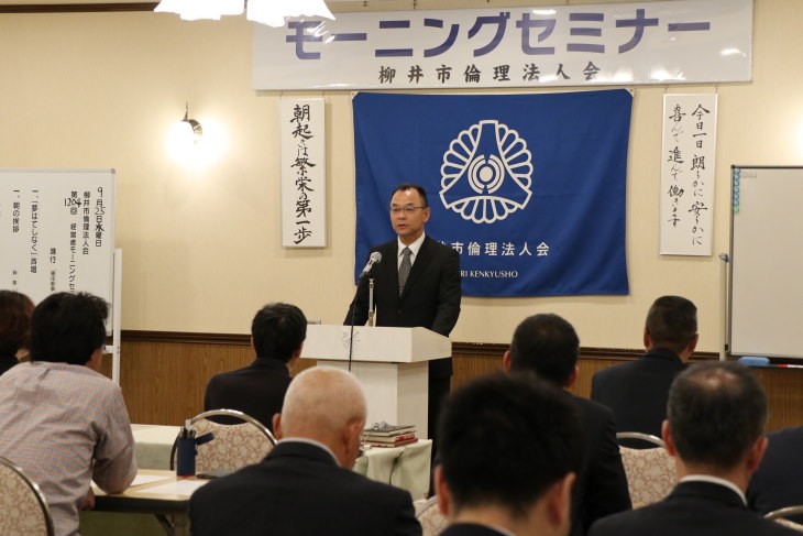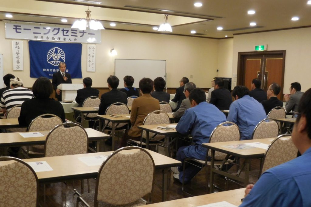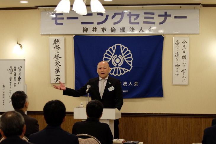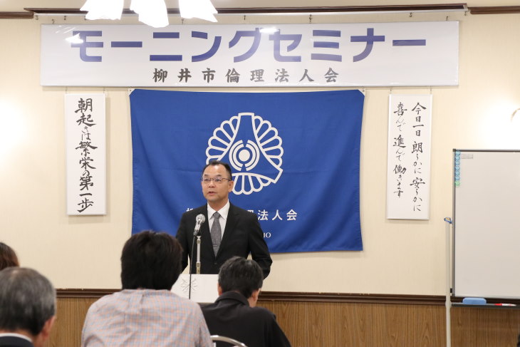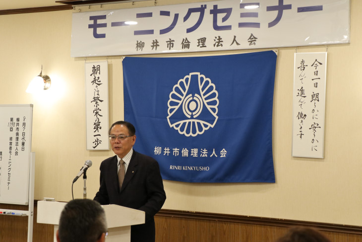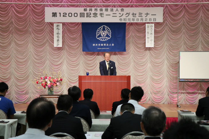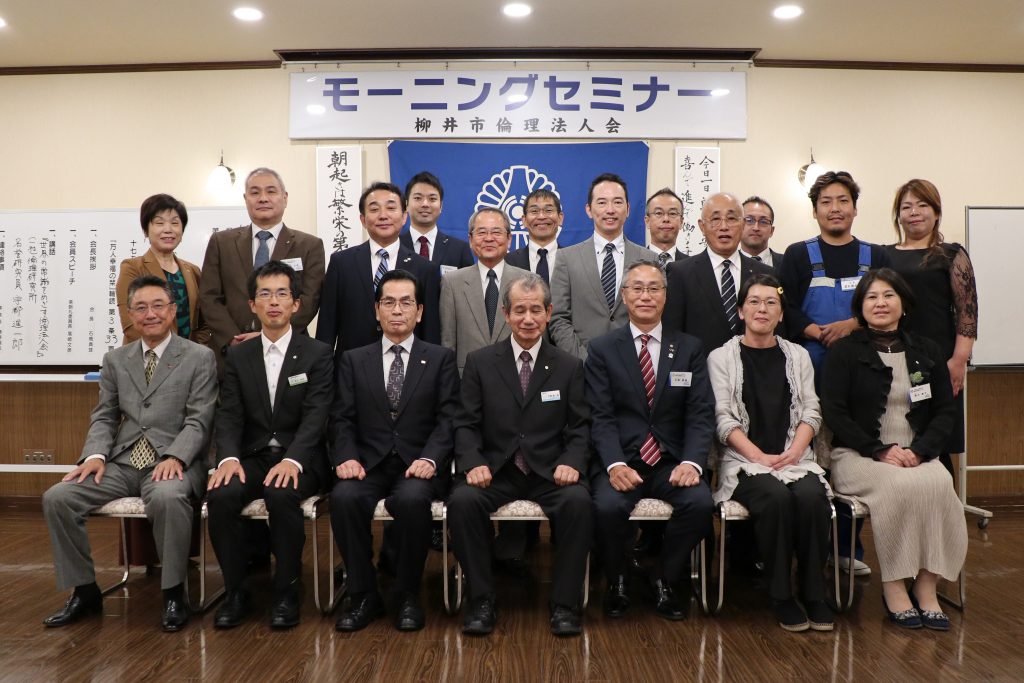 令和元年10月30日第1209回柳井市倫理法人会経営者モーニングセミナーは、(一社)倫理研究所 宇都 進一郎 名誉研究員をお招きし「世界の常識をめざす倫理法人会」をテーマにお話いただきました。宇都氏は倫理法人会立ち上げから倫理法人会に携わってこられて、50年になられるそうです。立ち上げや全国に拡げていく課程での苦労や喜び、柳井市倫理法人会の開設時の思い出などお話下さいました。また、今回のテーマについては、日本文化は、東洋や西洋など外国から伝わった文化や宗教などに日本独自の文化が融合して出来ていて、2600年以上継続している。純粋倫理は日本文化として世界に伝えていき、世界からいただいた恩に恩返ししていかなければならないとお聞きし、倫理の学びのすばらしさと共に、使命に背筋がピンと伸びる気がしたモーニングセミナーでした。