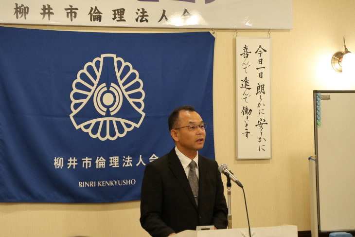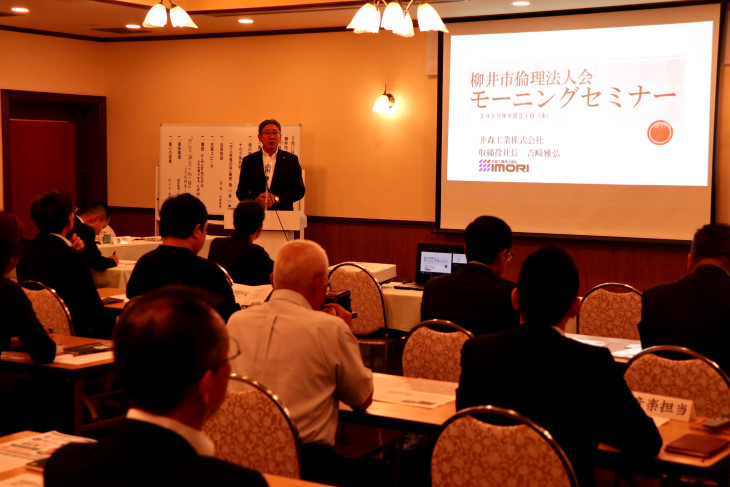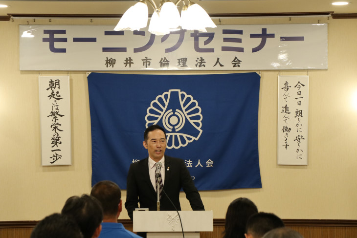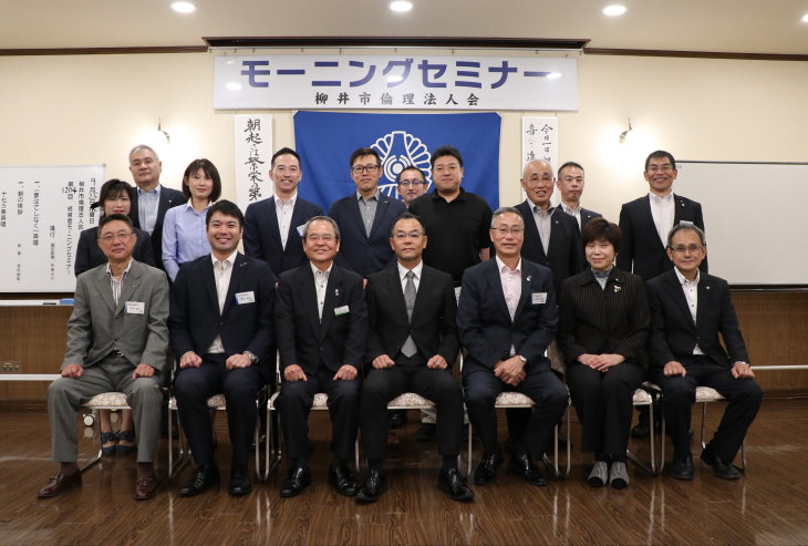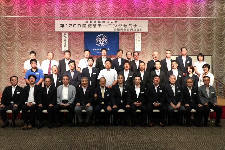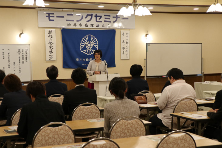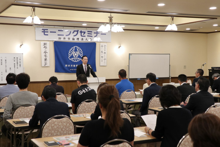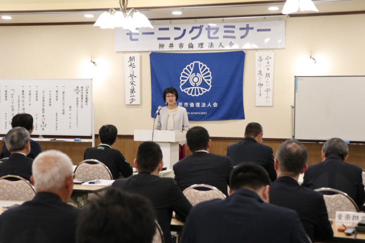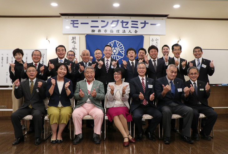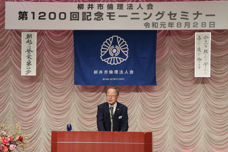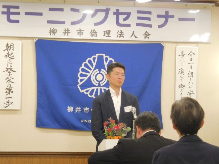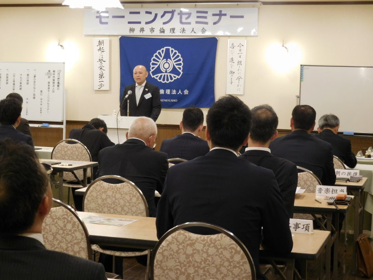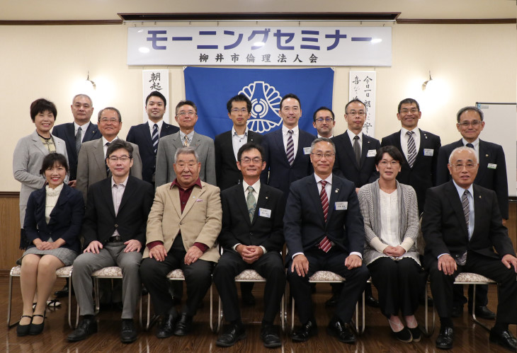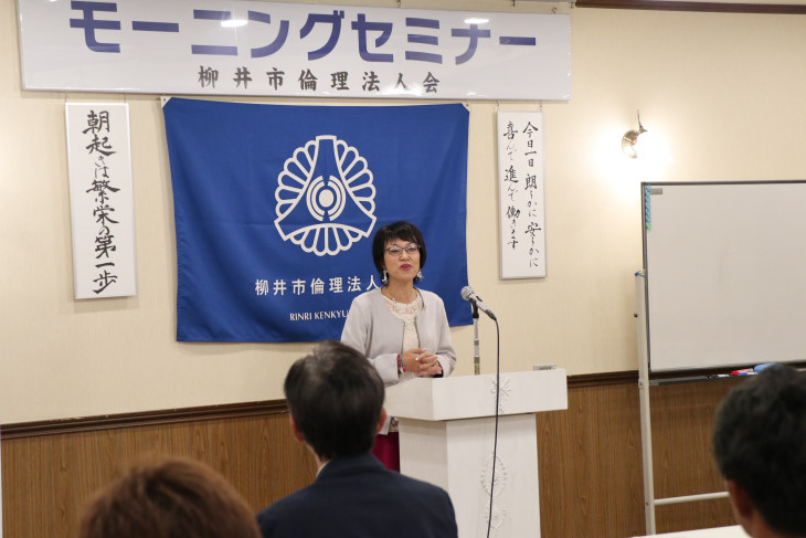 令和元年10月30日第1209回柳井市倫理法人会経営者モーニングセミナーは、(一社)倫理研究所 宇都 進一郎 名誉研究員をお招きし「世界の常識をめざす倫理法人会」をテーマにお話いただきました。宇都氏は倫理法人会立ち上げから倫理法人会に携わってこられて、50年になられるそうです。立ち上げや全国に拡げていく課程での苦労や喜び、柳井市倫理法人会の開設時の思い出などお話下さいました。また、今回のテーマについては、日本文化は、東洋や西洋など外国から伝わった文化や宗教などに日本独自の文化が融合して出来ていて、2600年以上継続している。純粋倫理は日本文化として世界に伝えていき、世界からいただいた恩に恩返ししていかなければならないとお聞きし、倫理の学びのすばらしさと共に、使命に背筋がピンと伸びる気がしたモーニングセミナーでした。