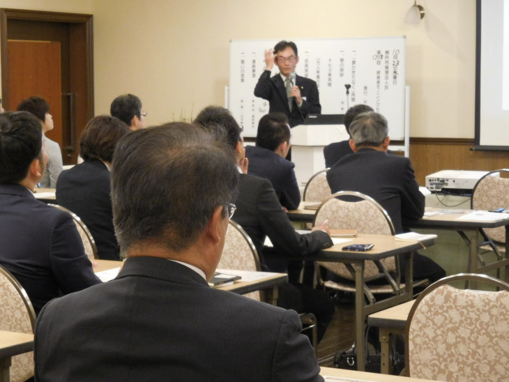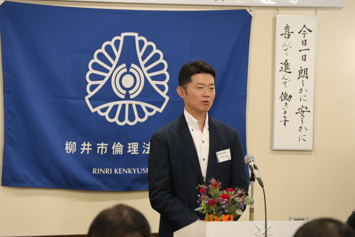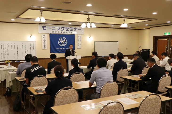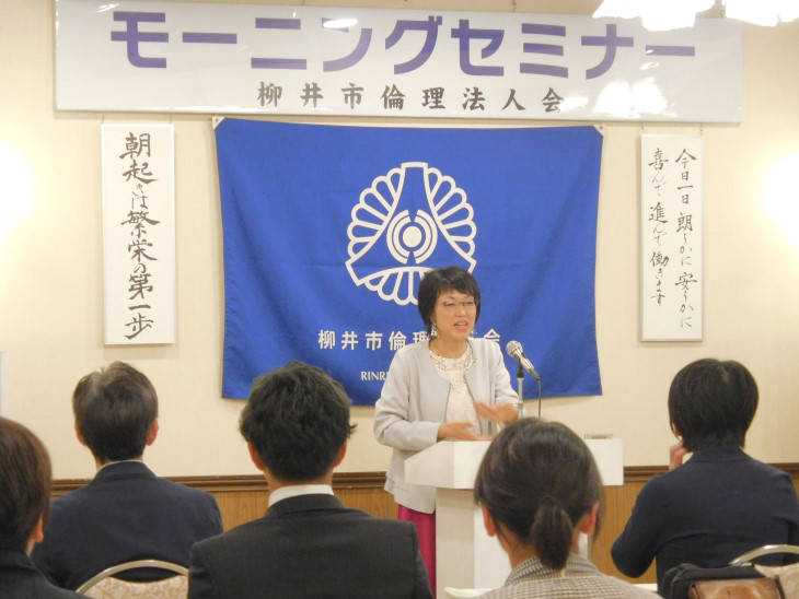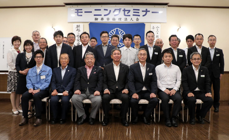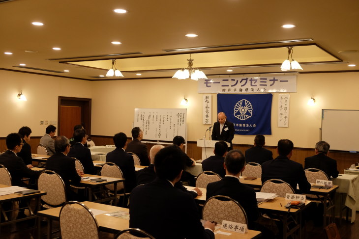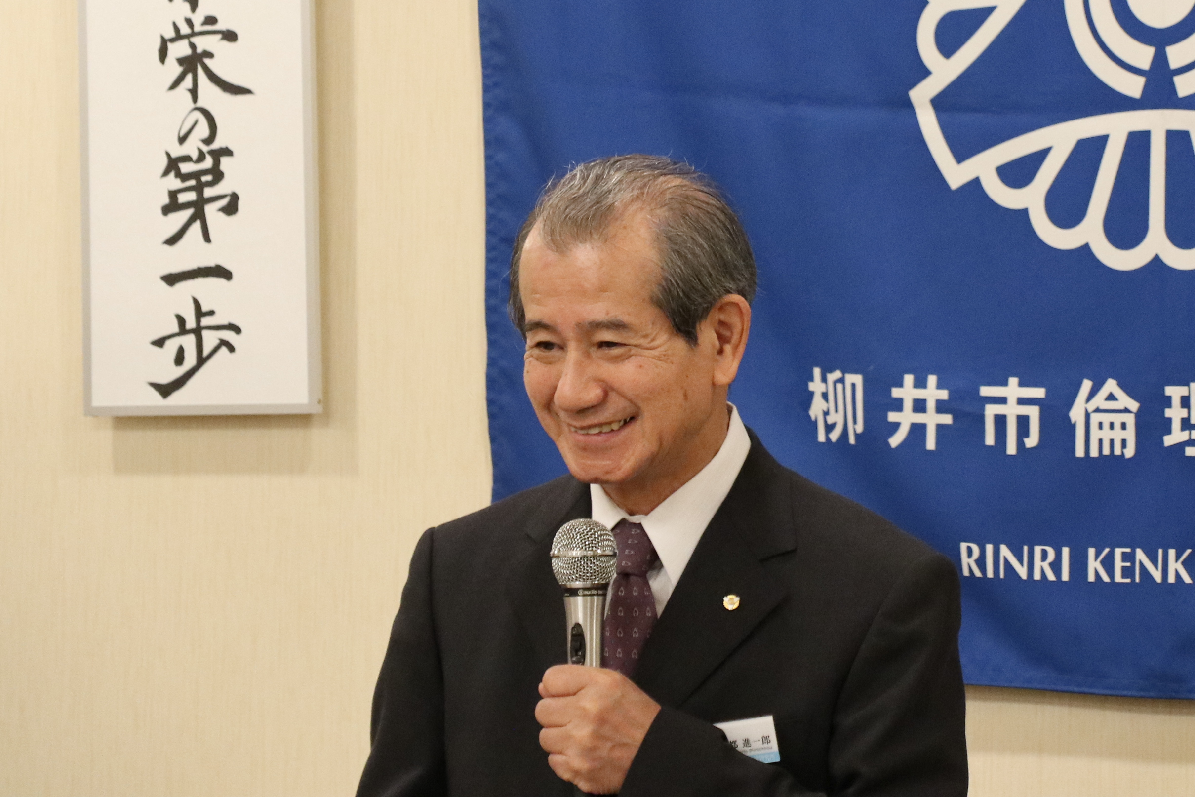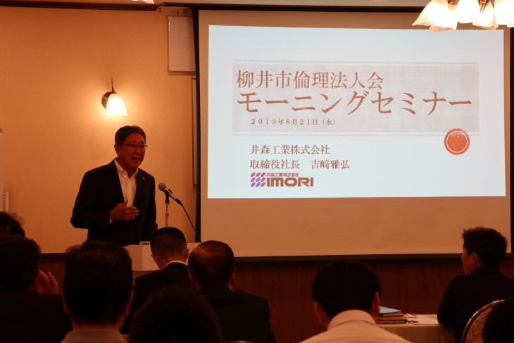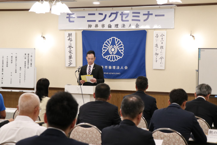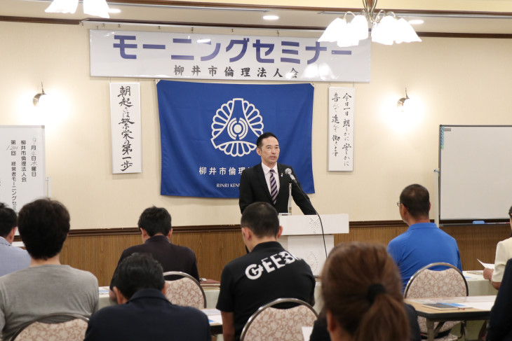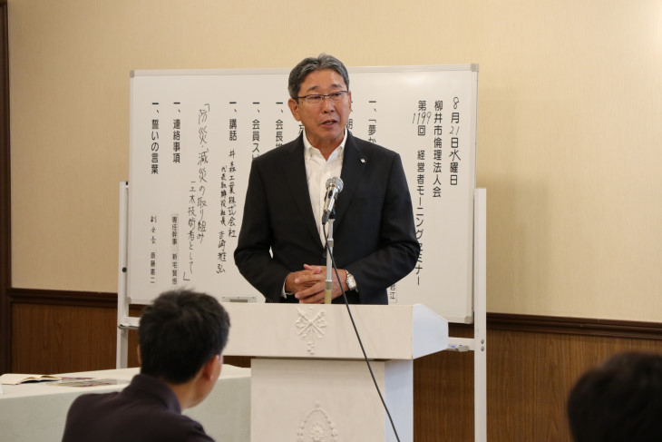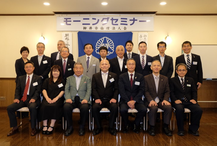 令和元年10月30日第1209回柳井市倫理法人会経営者モーニングセミナーは、(一社)倫理研究所 宇都 進一郎 名誉研究員をお招きし「世界の常識をめざす倫理法人会」をテーマにお話いただきました。宇都氏は倫理法人会立ち上げから倫理法人会に携わってこられて、50年になられるそうです。立ち上げや全国に拡げていく課程での苦労や喜び、柳井市倫理法人会の開設時の思い出などお話下さいました。また、今回のテーマについては、日本文化は、東洋や西洋など外国から伝わった文化や宗教などに日本独自の文化が融合して出来ていて、2600年以上継続している。純粋倫理は日本文化として世界に伝えていき、世界からいただいた恩に恩返ししていかなければならないとお聞きし、倫理の学びのすばらしさと共に、使命に背筋がピンと伸びる気がしたモーニングセミナーでした。