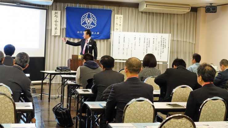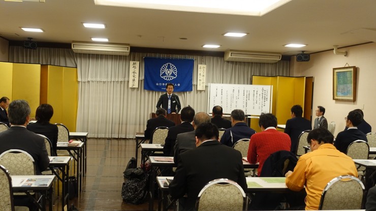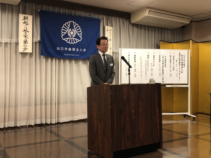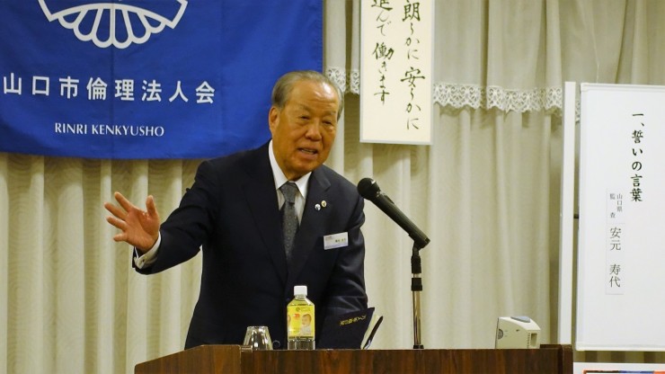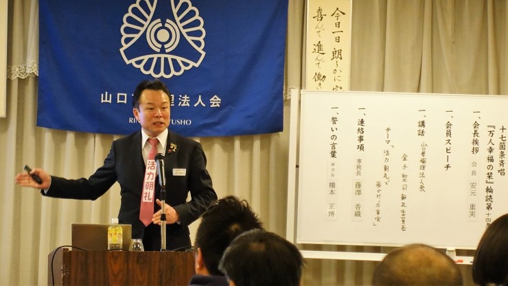 事業体験報告は法人局黒澤眞次参事で、テーマは「社徳が社格を創る」でした。戦後、大陸から仙崎への引き揚げ後、東京での父親急死による若くしての事業継承後、大きな失敗(デパート火災)から資格取得の必要性を痛感。散歩中に見つけた看板を見て参加したモーニングセミナーをきっかけに朝型の生活習慣が身に付いた。お陰で資格取得のための時間を作ることが出来、事業に生かすことが出来たことについての報告でした。