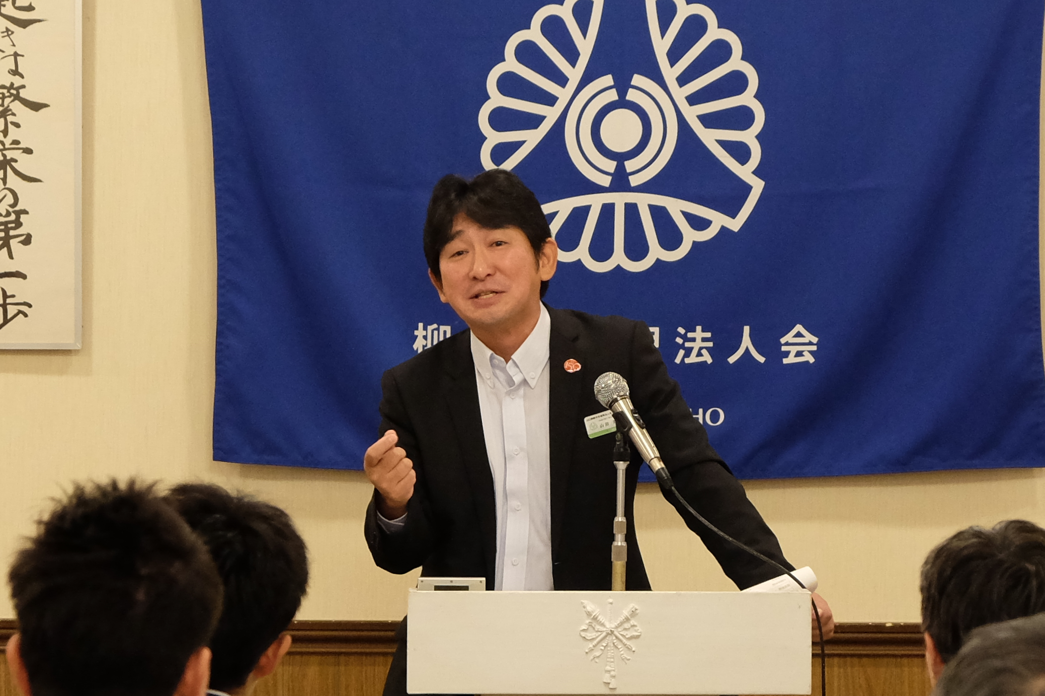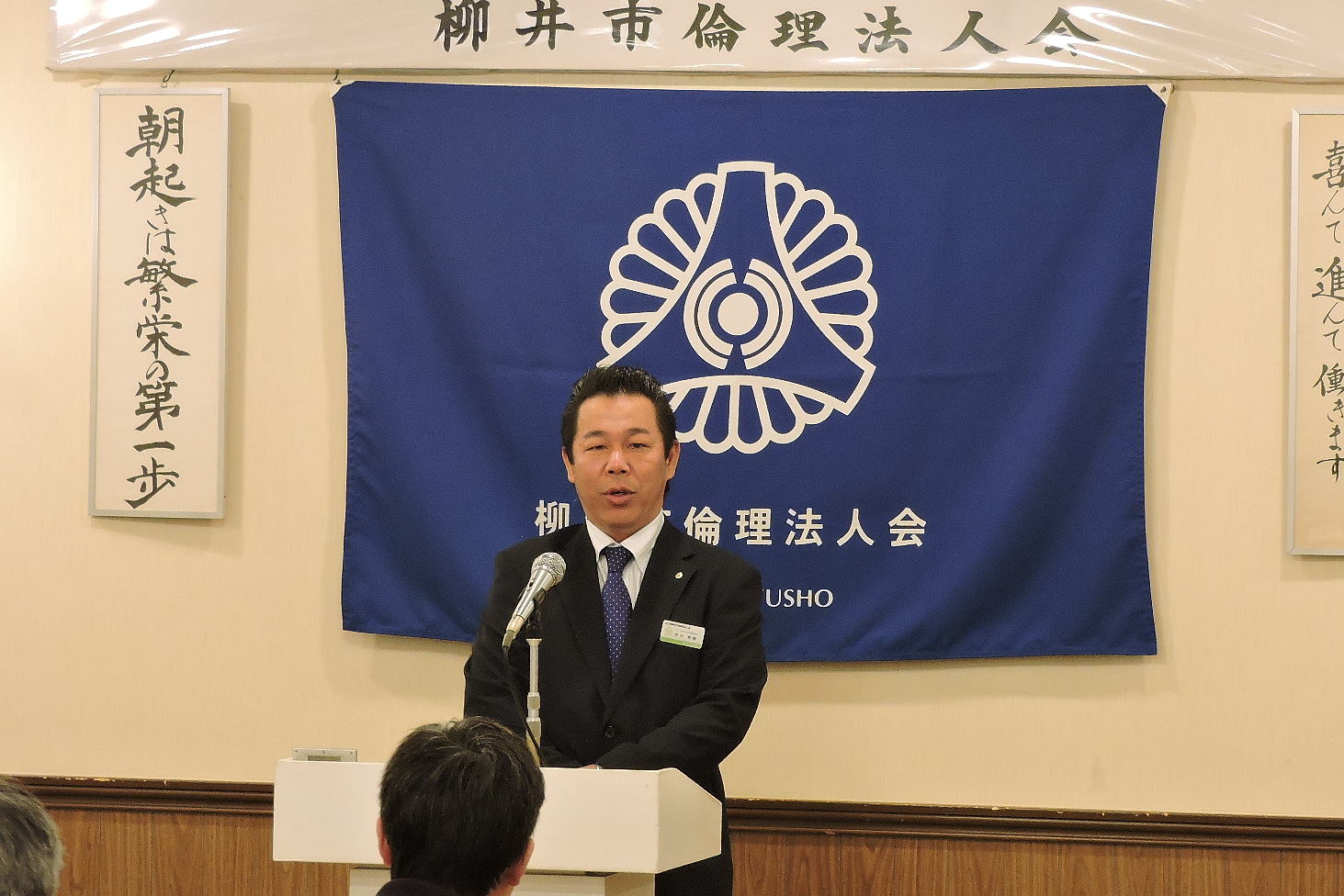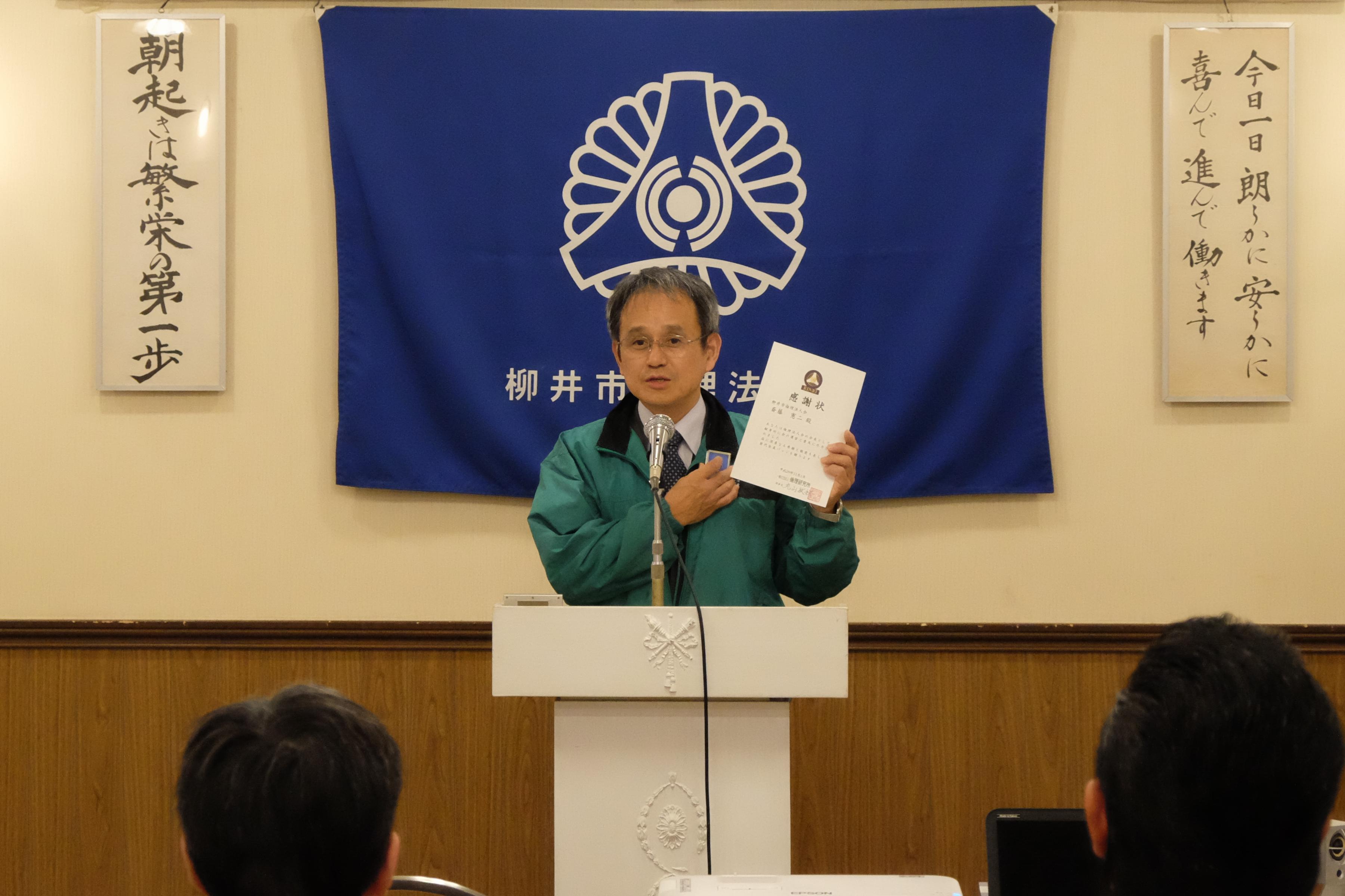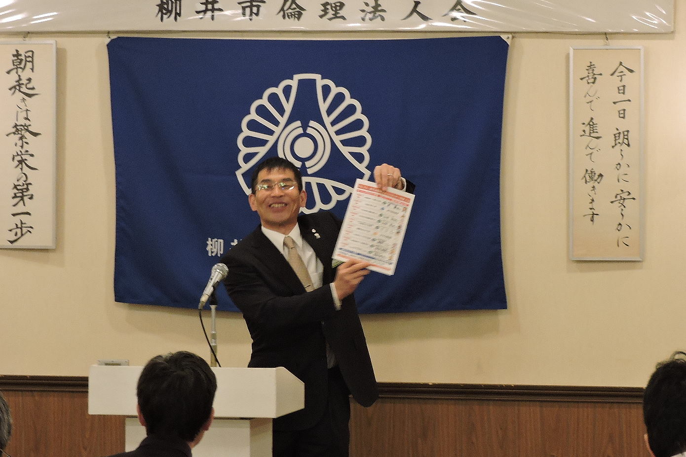 本日は石橋 貴雄 会長が出張により、斎藤 憲二 副会長((株)アデリー)が会長挨拶をされました。(株)アデリー社員、澤井 和宏 さんの初マラソン3時間切りの披露もありました。