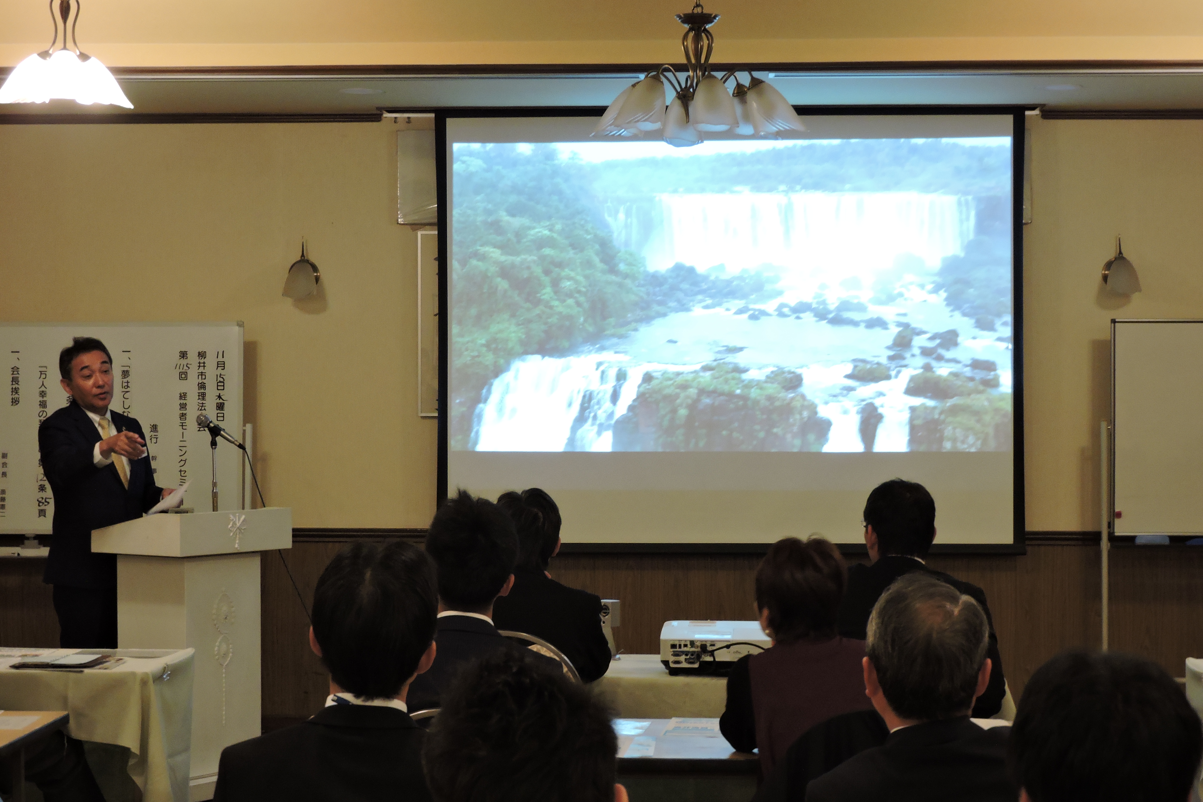 ブラジルの感想はとにかく明るい人が多い、また倫理の学びはとても真剣である。倫理の普及に関しては、なかなか難しいように感じられたとの事。ブラジル倫理法人会のスライドや、世界三大滝の『イグアスの滝』のビデオなど、楽しい報告をいただきました。