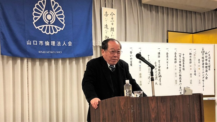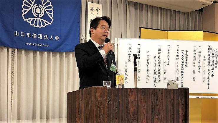 講話は、「子女名優」、万人幸福の栞を通して子供さんの不登校に向き合った経験についてでした。リーマンショック後売上減少の中での事業継承、単会会長就任した頃の出来事で、誤解から始まった次男さんの不登校に対して、夫婦のコミュニケーションの重要性に気づかれたそうです。その次男さんも今は大学生。最後に、モーニングセミナーは学びの場であり出会いの場でもある。人生を豊かにする実践ですと締めくくられました。