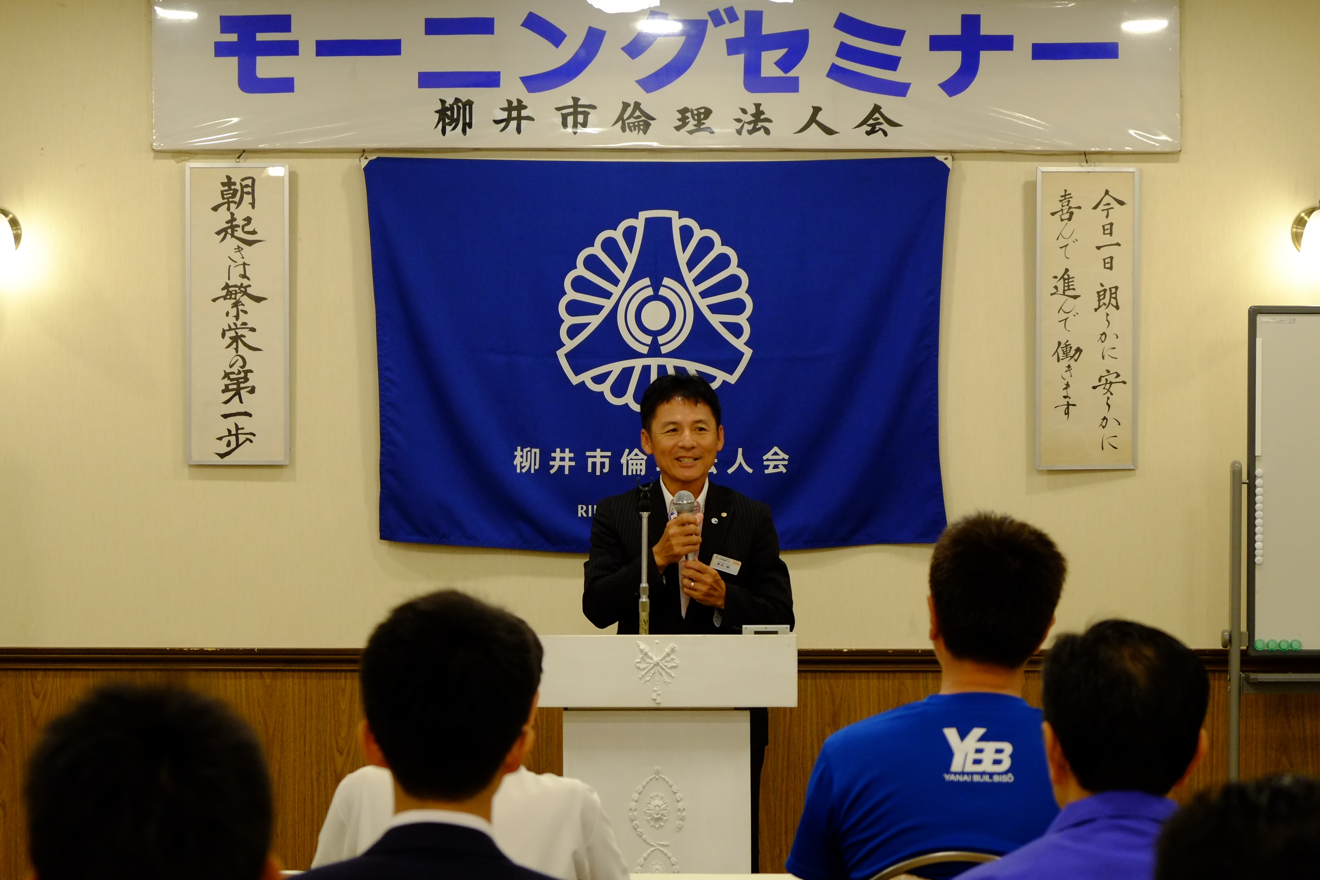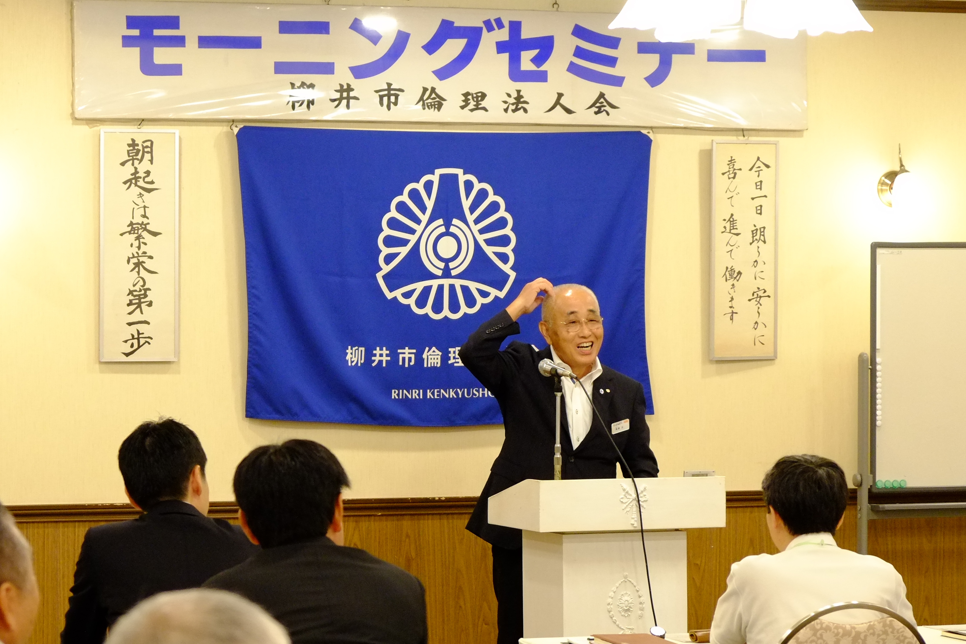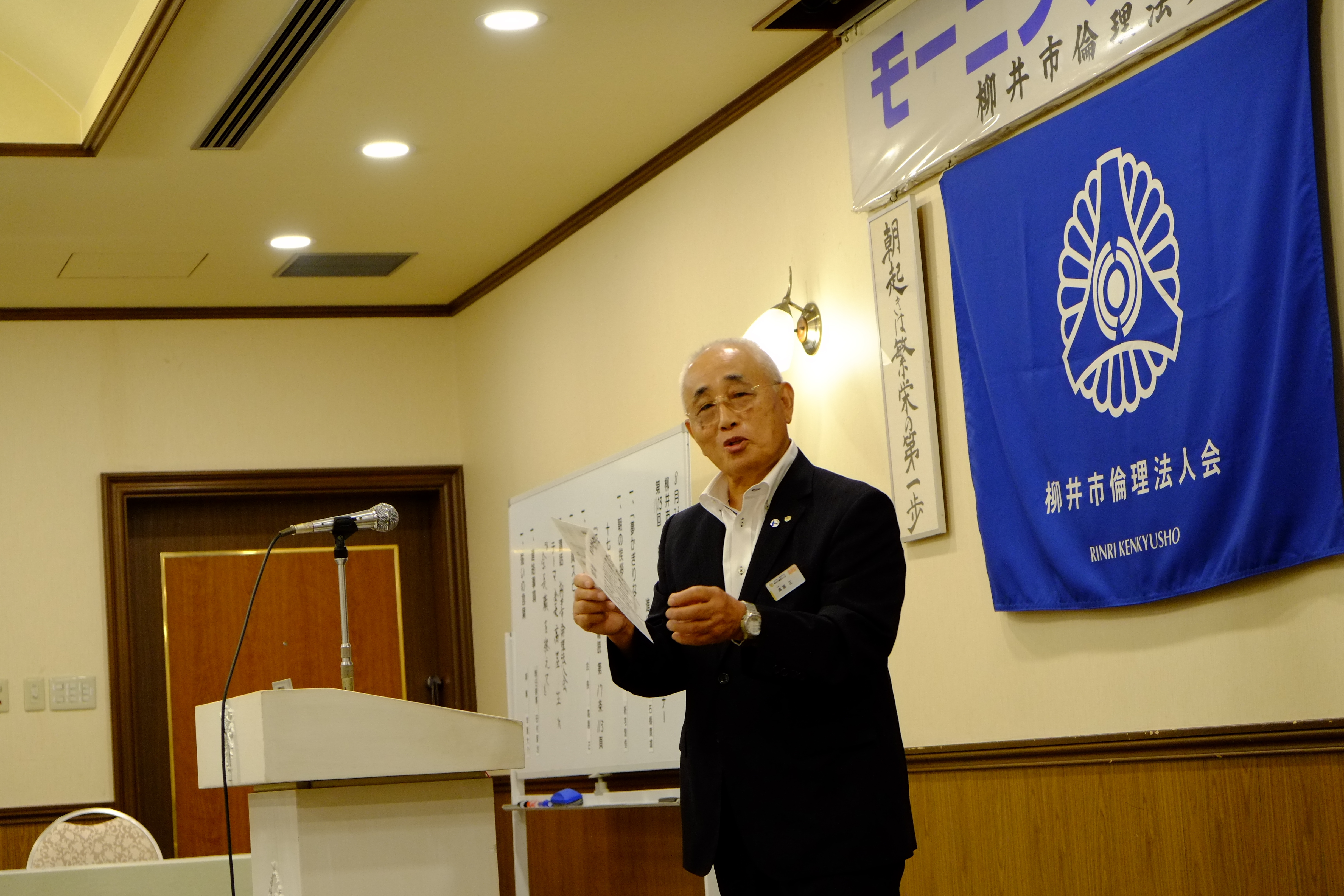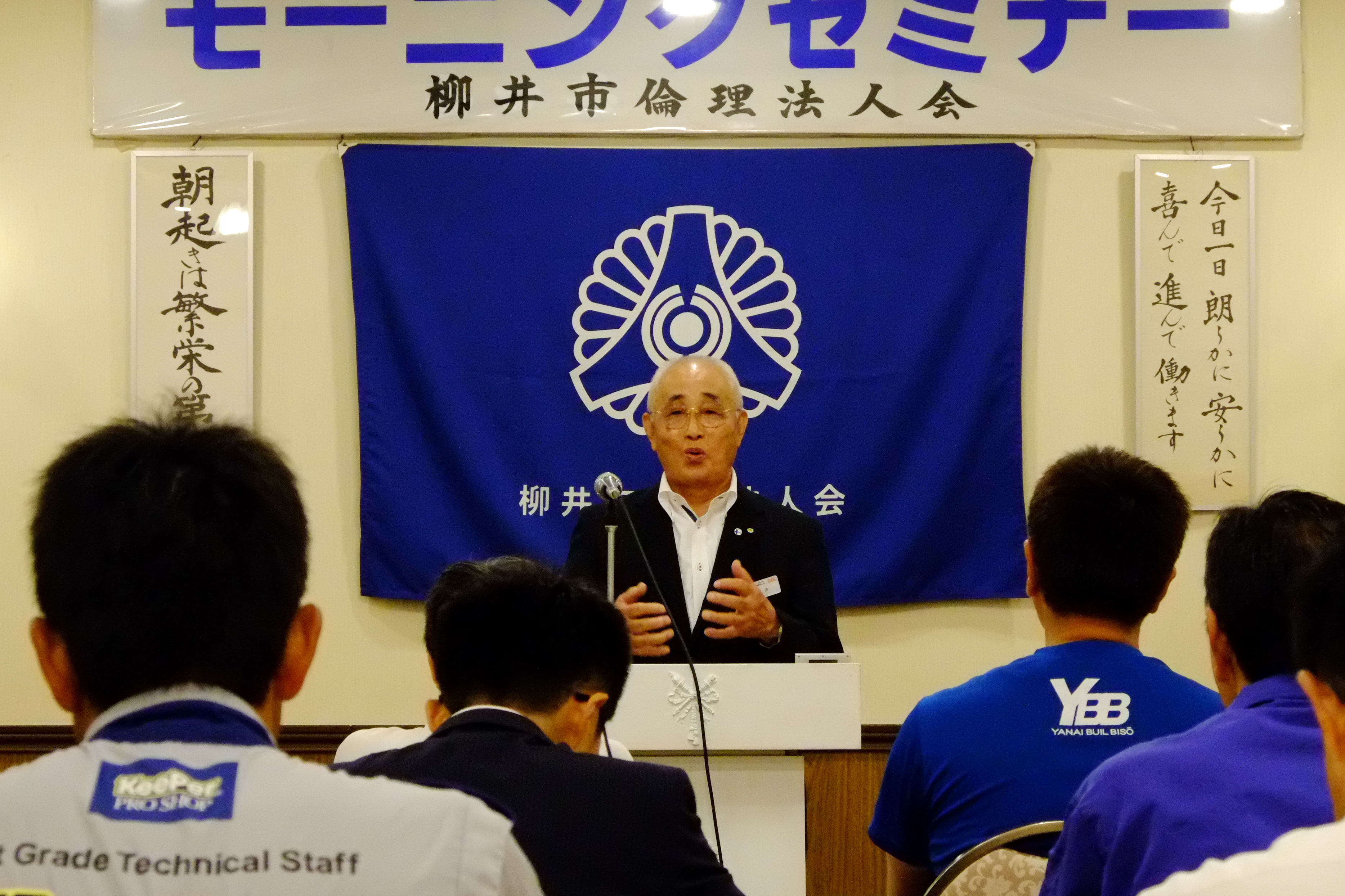 8月23日に行われた第1103回柳井市倫理法人会経営者モーニングセミナーは、「会長職を終えて」と題して、柳井市倫理法人会 会長 髙屋 正 氏(株式会社ダイドー通商東部 取締役相談役)の講話を聴きました。
