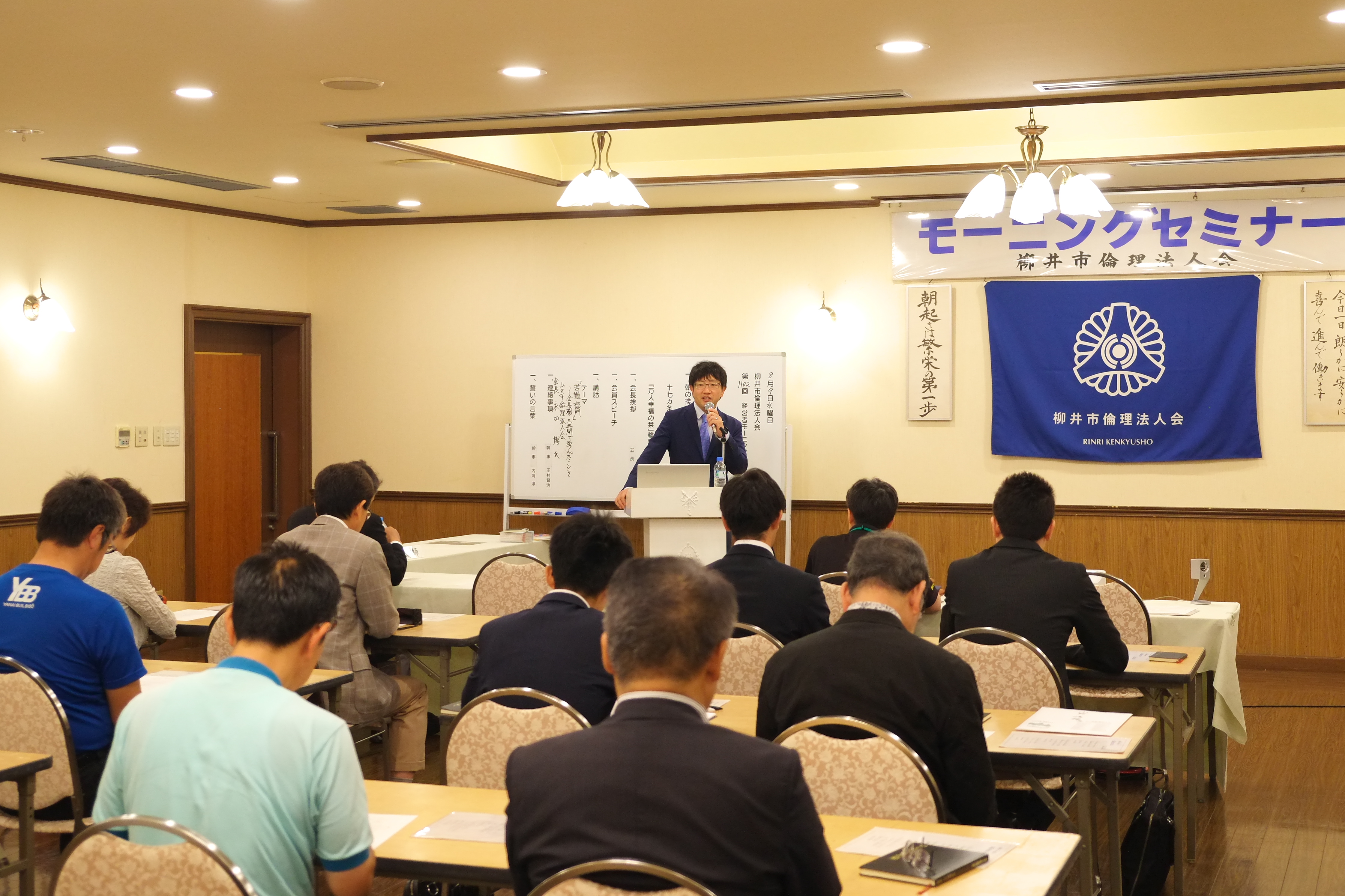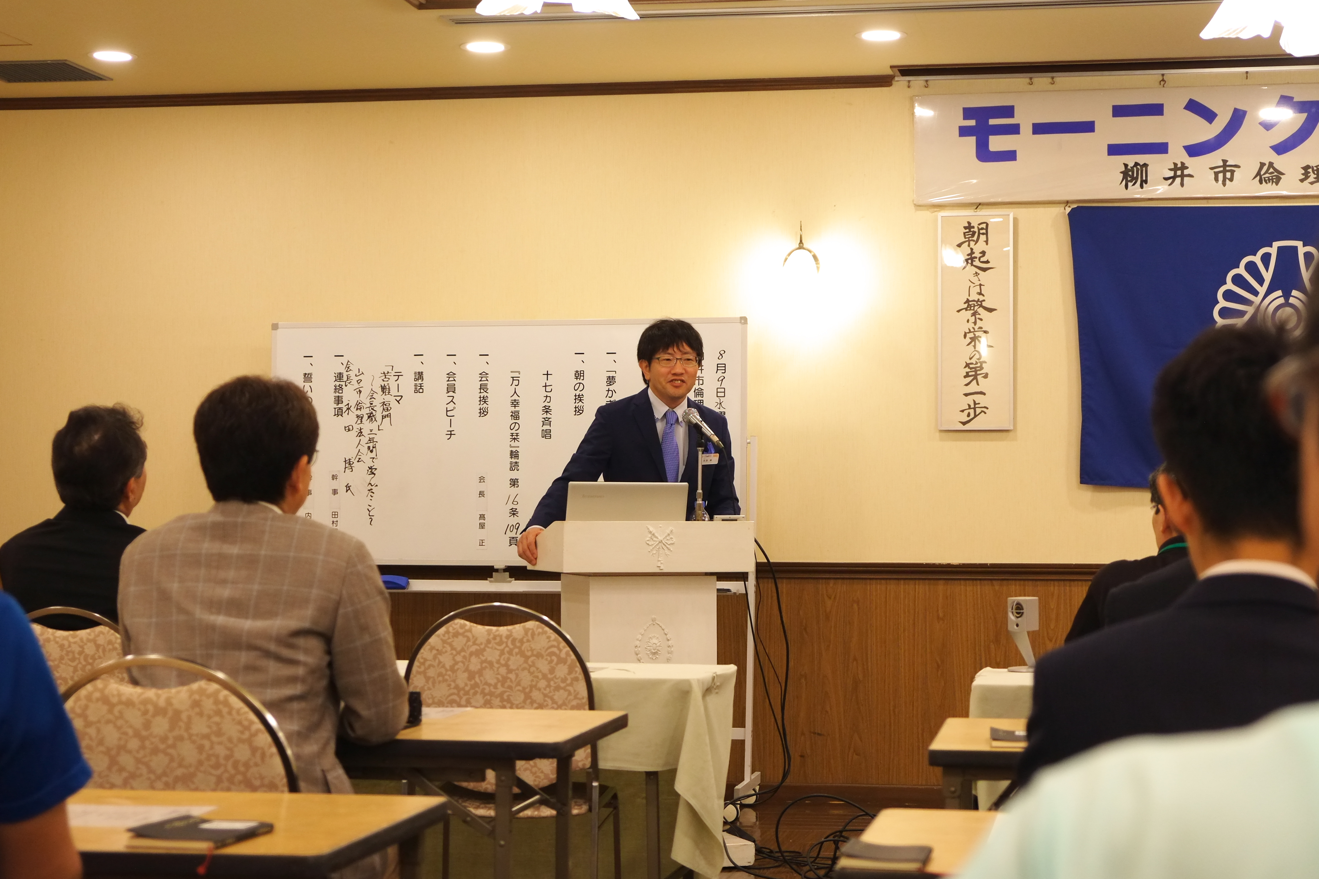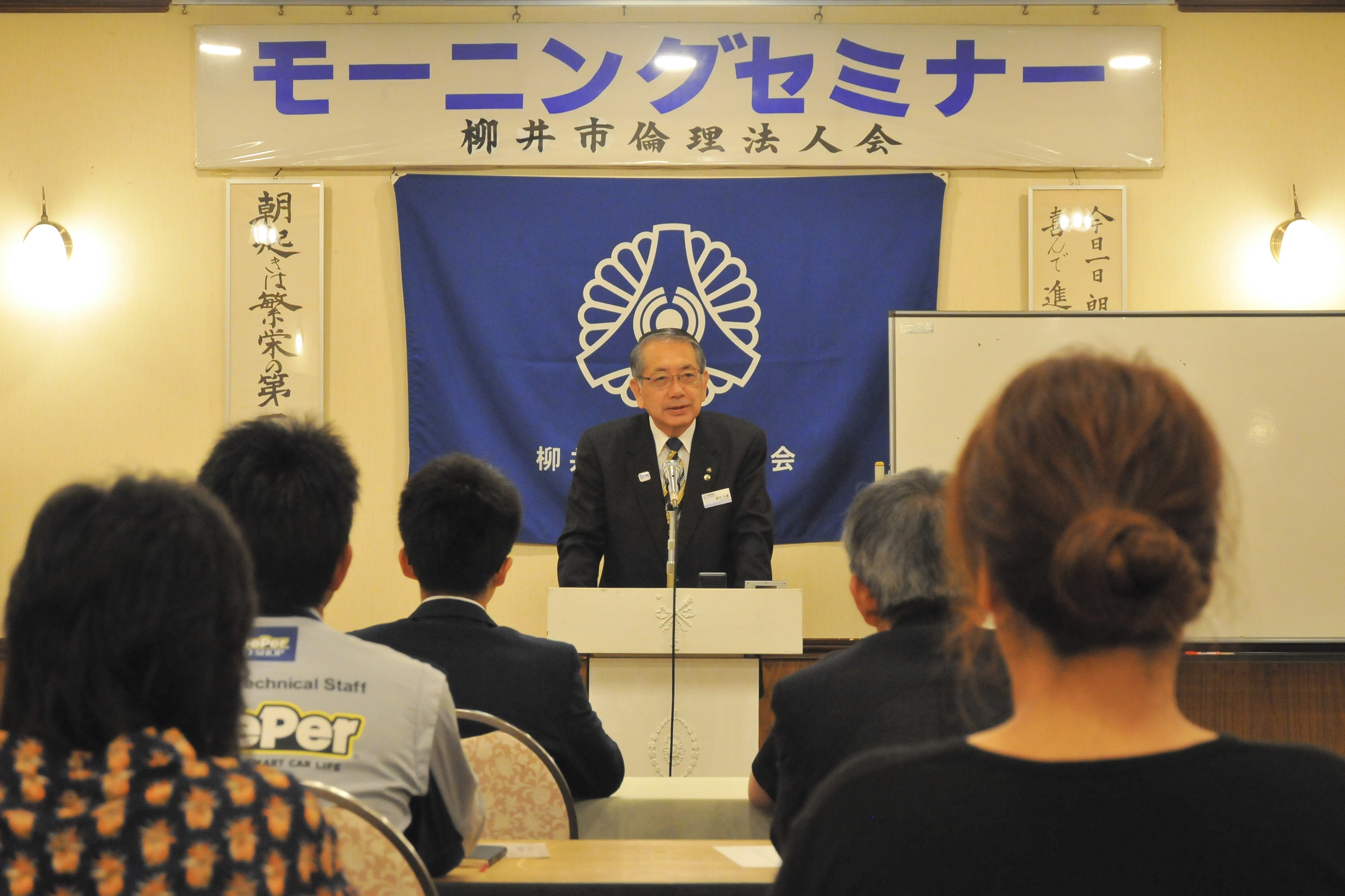 8月23日に行われた第1103回柳井市倫理法人会経営者モーニングセミナーは、「会長職を終えて」と題して、柳井市倫理法人会 会長 髙屋 正 氏(株式会社ダイドー通商東部 取締役相談役)の講話を聴きました。