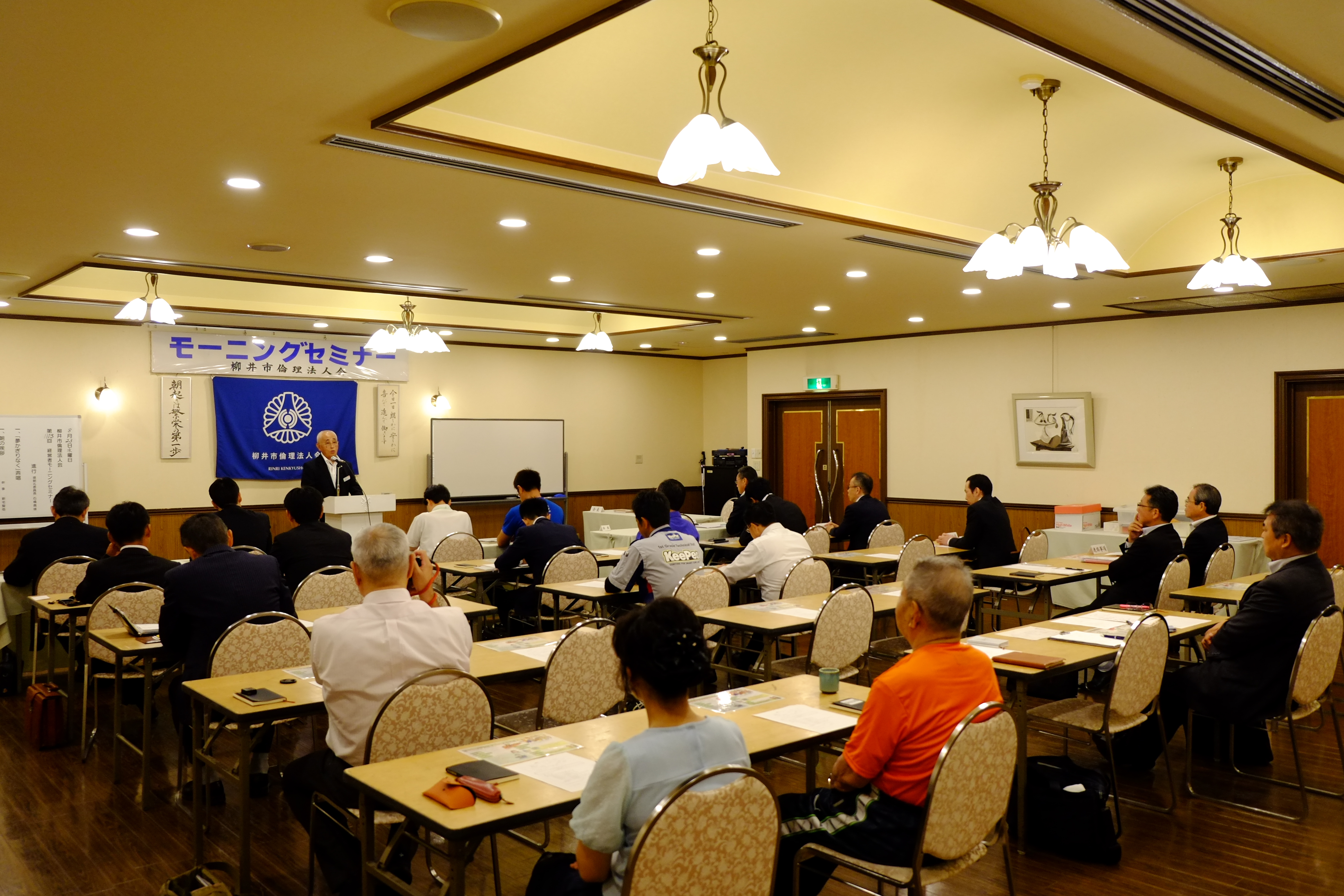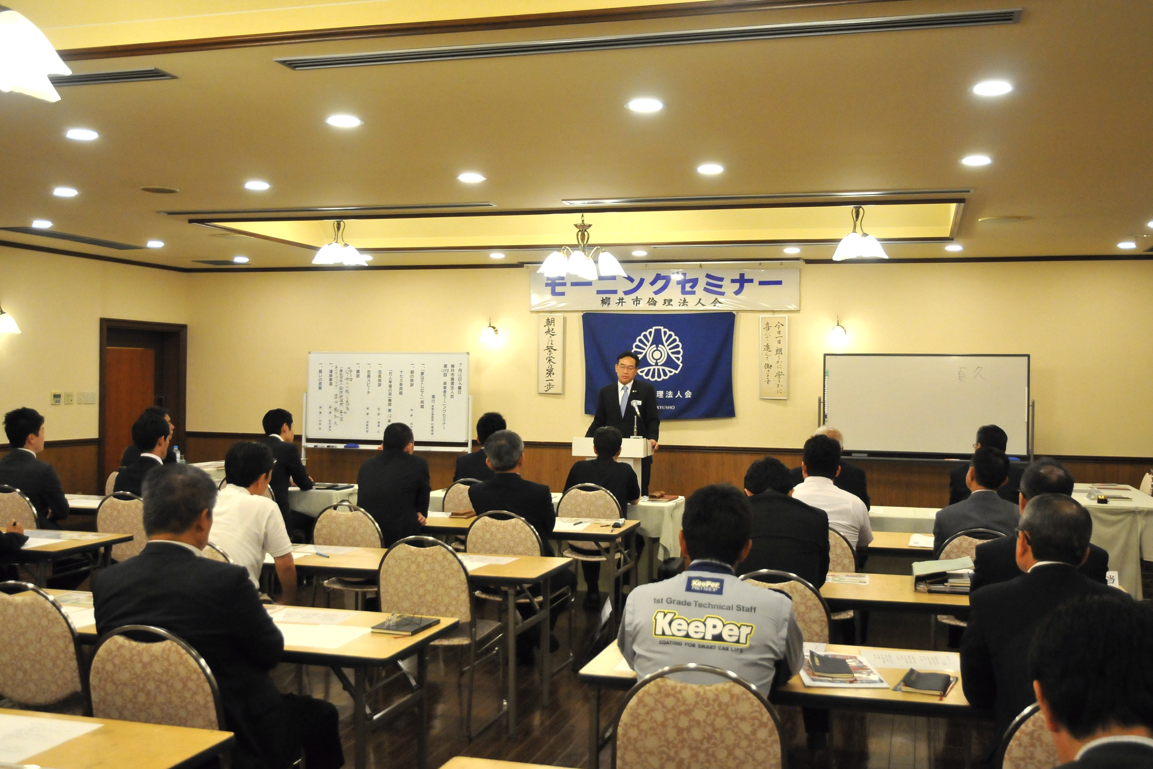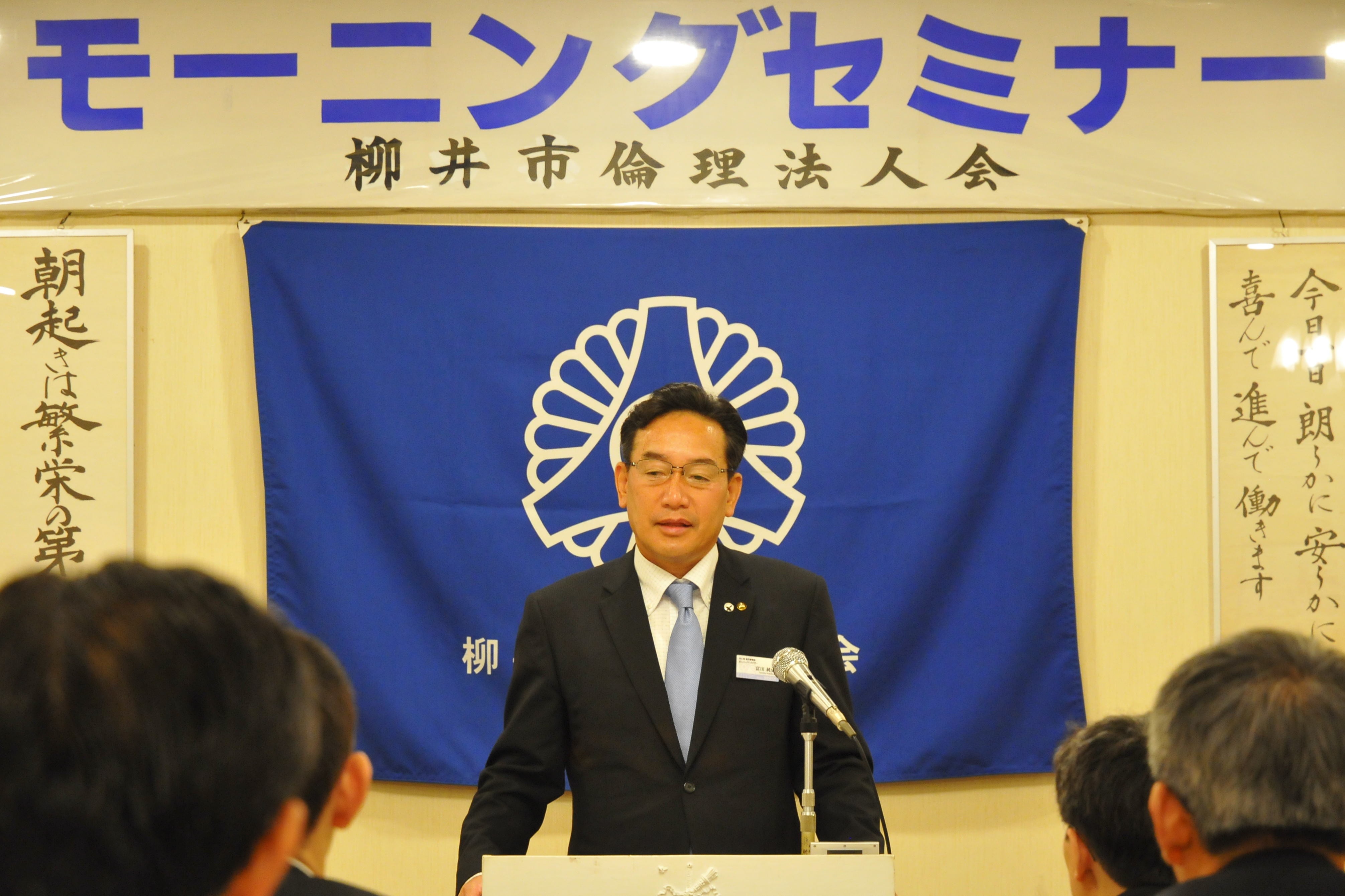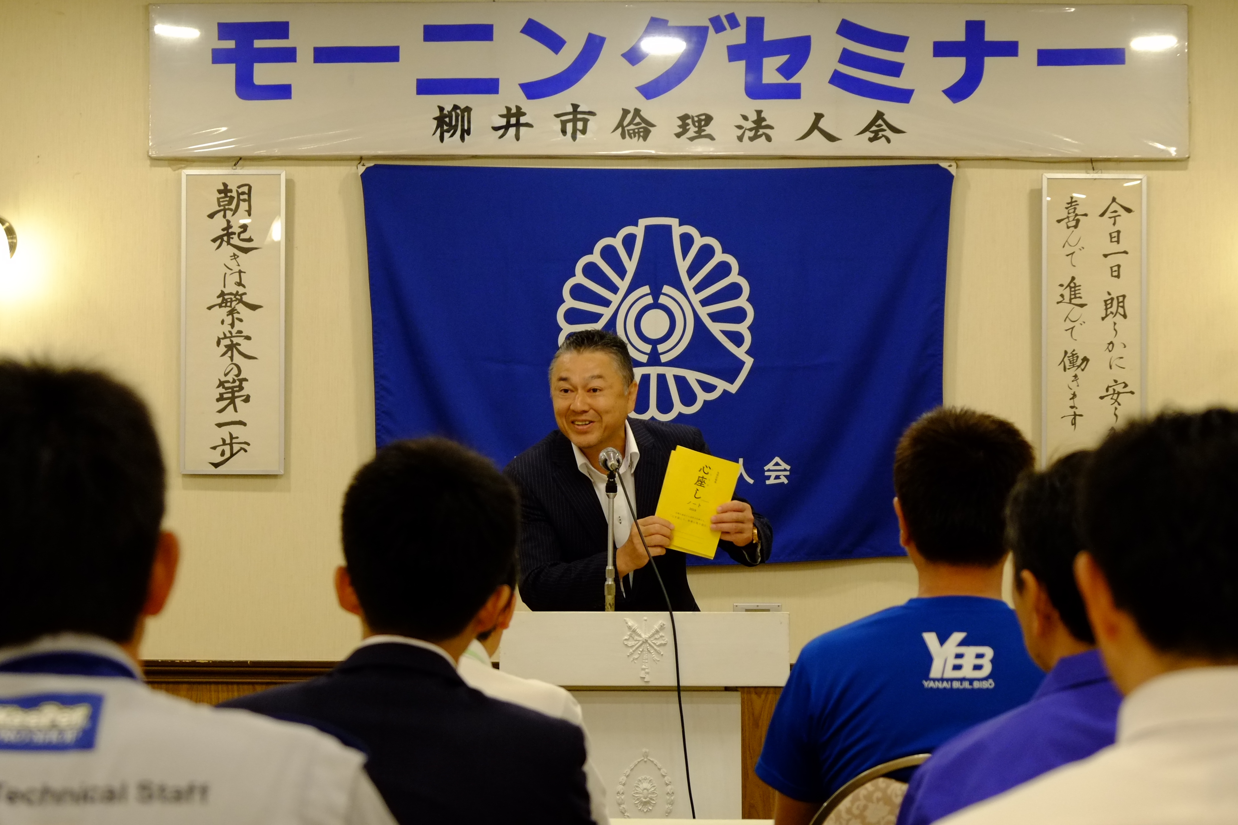 8月23日に行われた第1103回柳井市倫理法人会経営者モーニングセミナーは、「会長職を終えて」と題して、柳井市倫理法人会 会長 髙屋 正 氏(株式会社ダイドー通商東部 取締役相談役)の講話を聴きました。