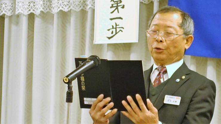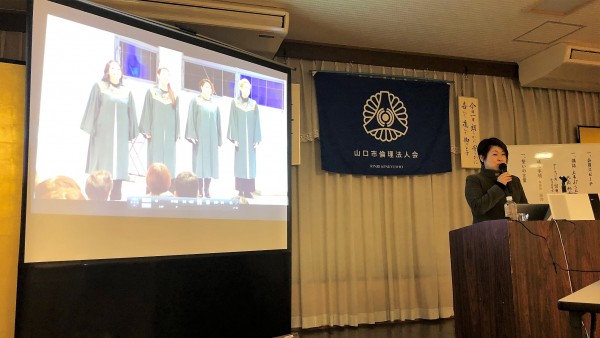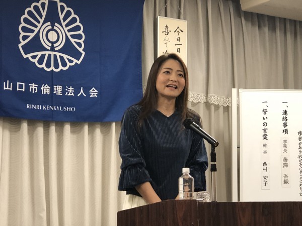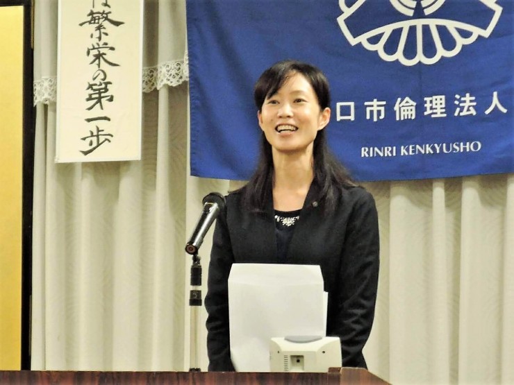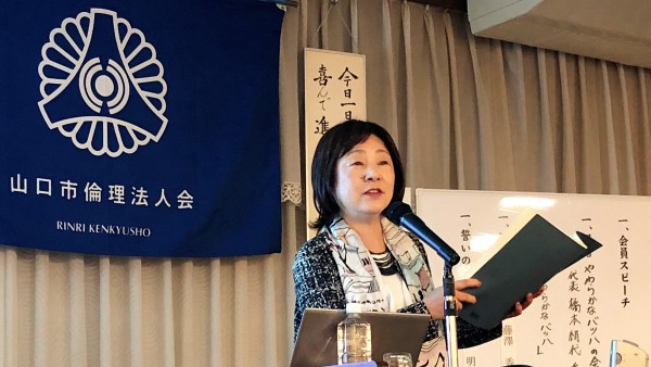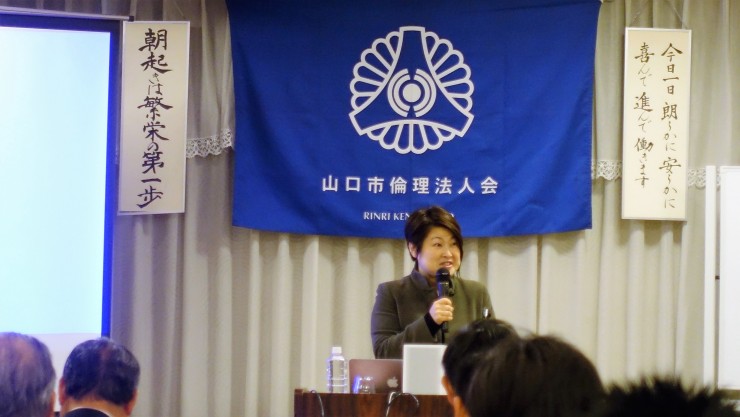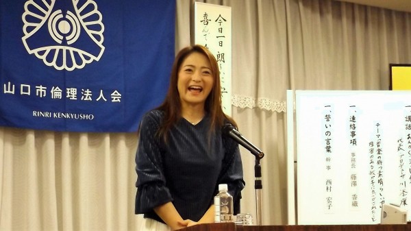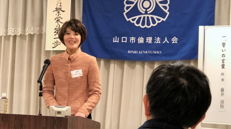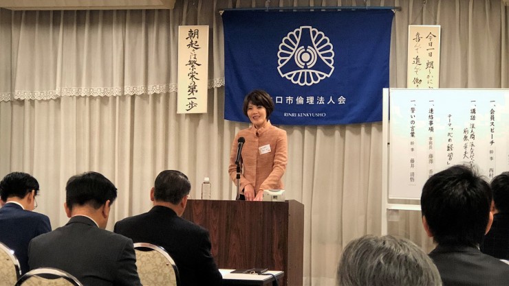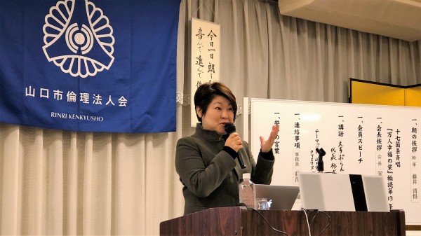 本日は、山口コア学園理事長の池田弥生氏の講話でした。山口コア学園は、平成元年に山口市の誘致で開校し、全国8都市に姉妹校が10校あるそうです。