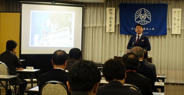 山口コア学園には、ITを活用する幅広い人材を養成する「山口コアカレッジ」とリハビリ専門職を養成する「山口コ・メディカル学院」の2つの専門学校があります。講話では、学校の特色だけでなく、18歳人口動態やIT業界の動向と県の取り組み、企業の求める人材像など分かりやすく解説して頂きました。
