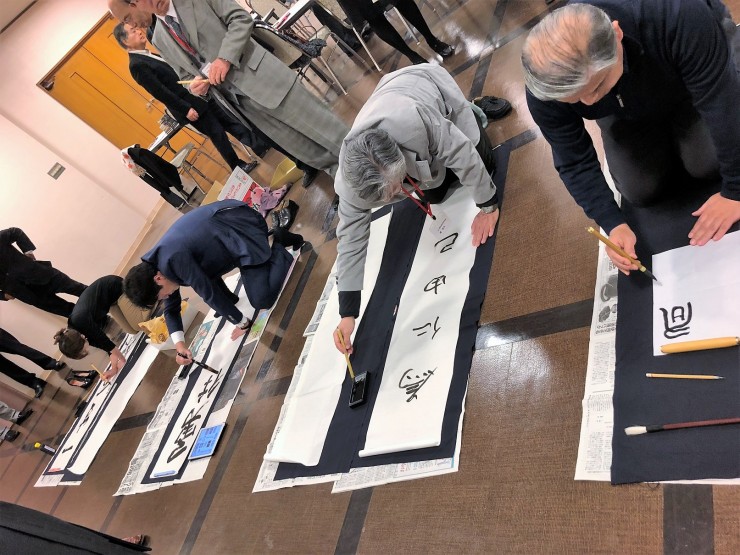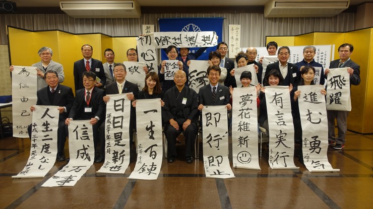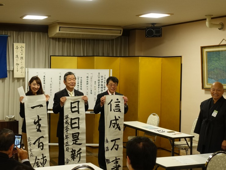 新年の理事長挨拶を聞き、新春書初めを行う前に恒例になった椿正春和尚から講話をしていただきました。「萬波不離水」、人生とは水と(万)波が離れて存在できないようなものである。1日1日、1時間1時間を大切に生きなさいと教えていただきました。