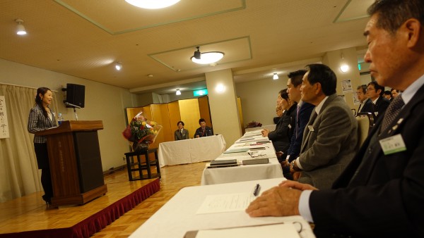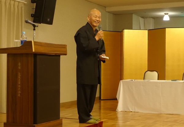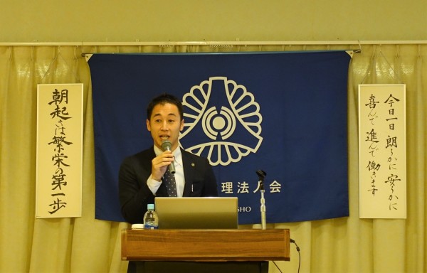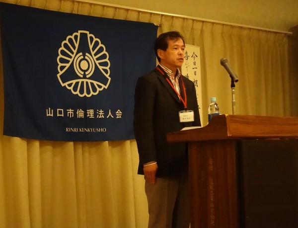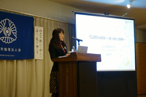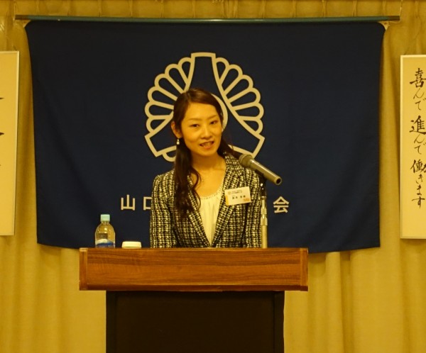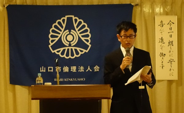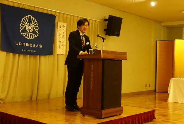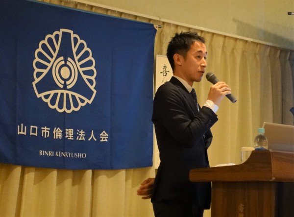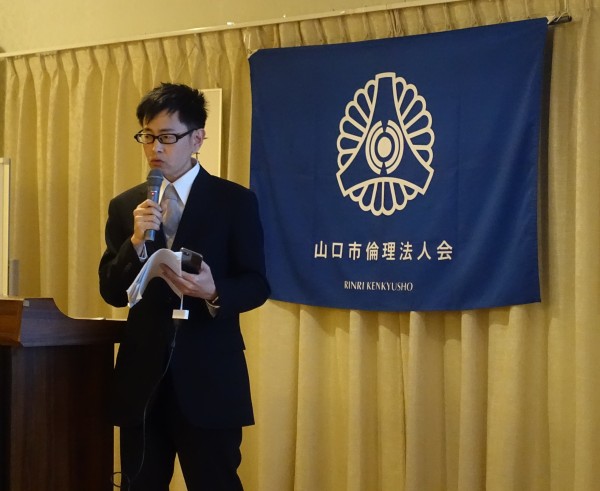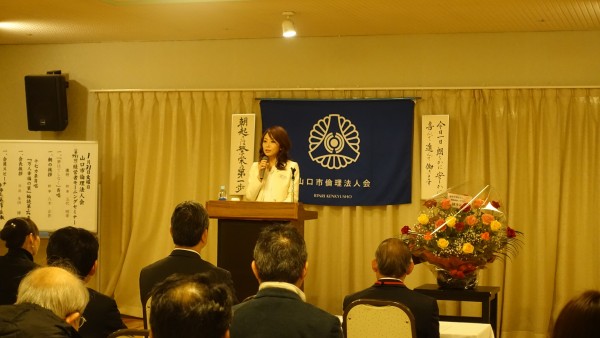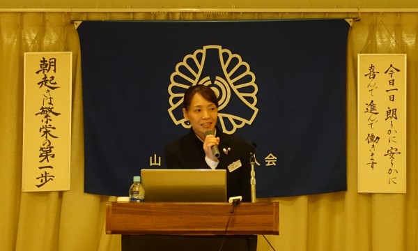 講話は、期待通りに参加者を多く集めていただいた金田千明県研修委員長です。山口市もようやく喜動キャンペーン達成できました。富士研直後の講話と言うこともあり、女性の視点から研修の様子を聞かせていただきました。自身初めての参加にも拘わらず研修委員長としての周囲への配慮を絶賛する声はあちこちから聞いています。美しく活動的な彼女にもつらい出来事や単会の幹事としての仕事に悩んだ時期もあったそうで、そのような時、寄り添い励ましてくれた倫友の話には目頭が熱くなりました。事業所の移転直後の忙しい中、ありがとうございました。いくつかの単会での講話も決まっているようです。追っかけファンが増えるのは間違いないでしょう!
