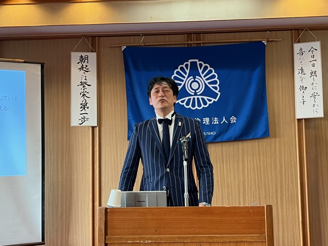 講話では、今まであった214のコンプレックスから始まり、それを2つの出会い(柔道と仕事での師匠)で克服して行ったお話をされました。また、倫理法人会単会の会長になって、感謝の心が増して、みなさんの成功が自分の成功と思えるようになった。みなさんも会長を目指してくださいとのことでした。