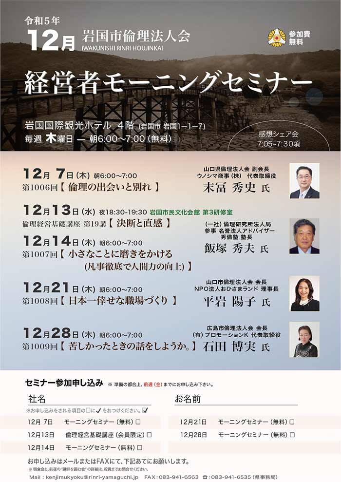 12月岩国市倫理法人会モーニングセミナー開催予定 朝食会1500円 講師を囲む会は5000円。前週(金)までの事前申し込みが必要です。 講師を囲む会は、つど場所が変わります。詳細は役員までお問い合わせください。