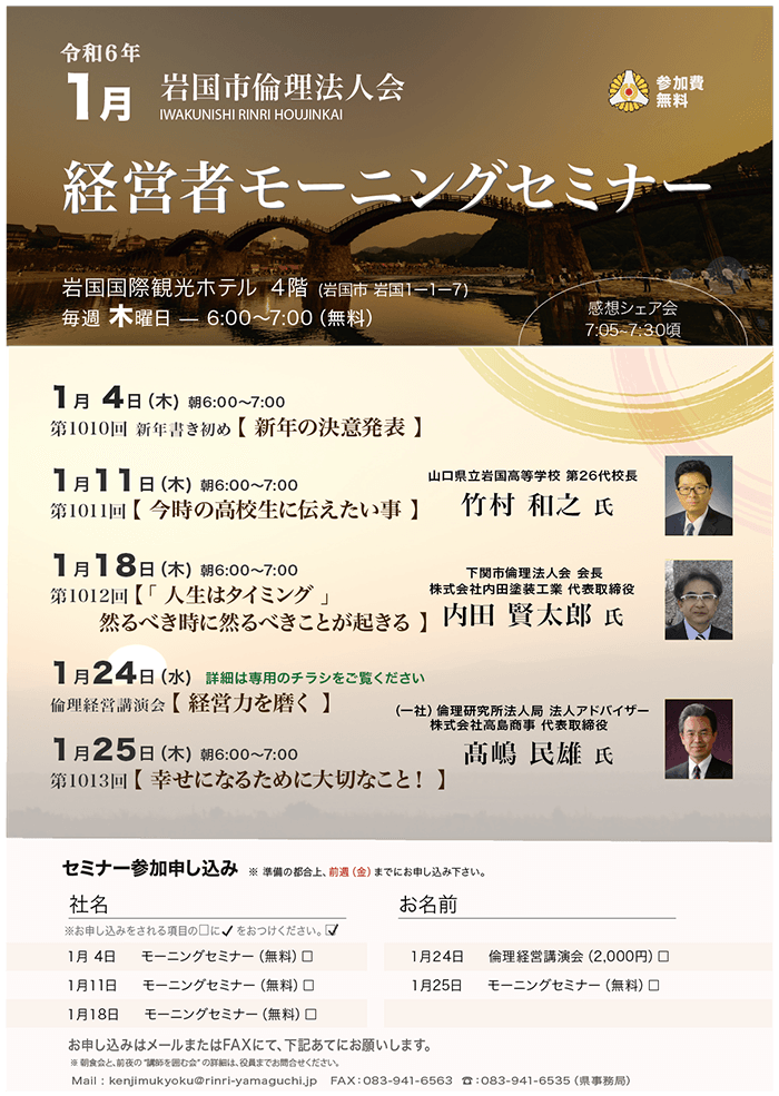 1月岩国市倫理法人会モーニングセミナー開催予定 1月24日倫理経営講演会の詳細チラシはこちらです。 朝食会1500円 講師を囲む会は5000円。前週(金)までの事前申し込みが必要です。 講師を囲む会は、つど場所が変わります。詳細は役員までお問い合わせください。