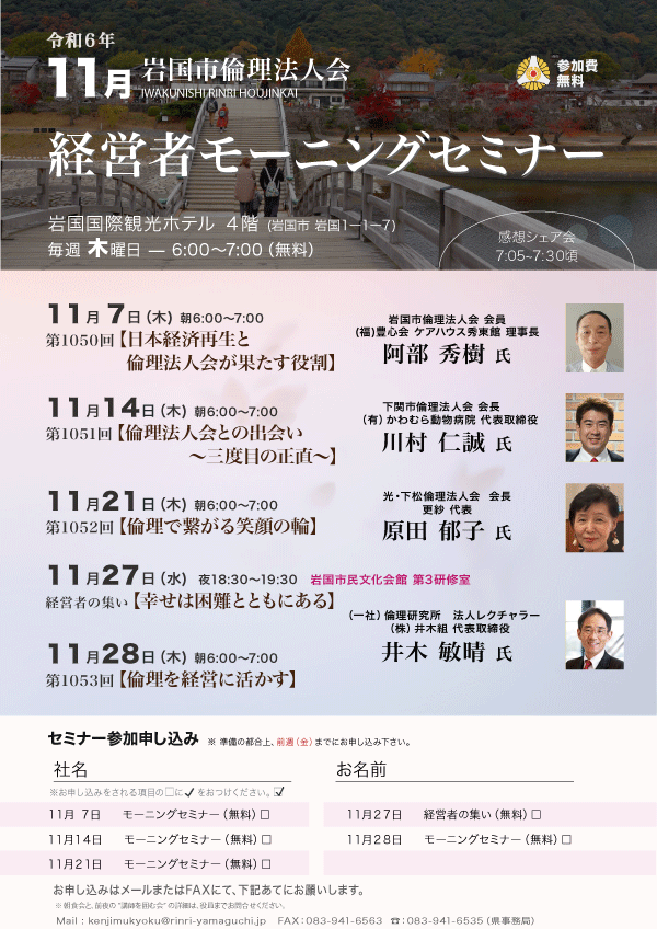 11月岩国市倫理法人会モーニングセミナー開催予定 朝食会1500円 講師を囲む会は5000円。前週(金)までの事前申し込みが必要です。 講師を囲む会は、つど場所が変わります。詳細は役員までお問い合わせください。
