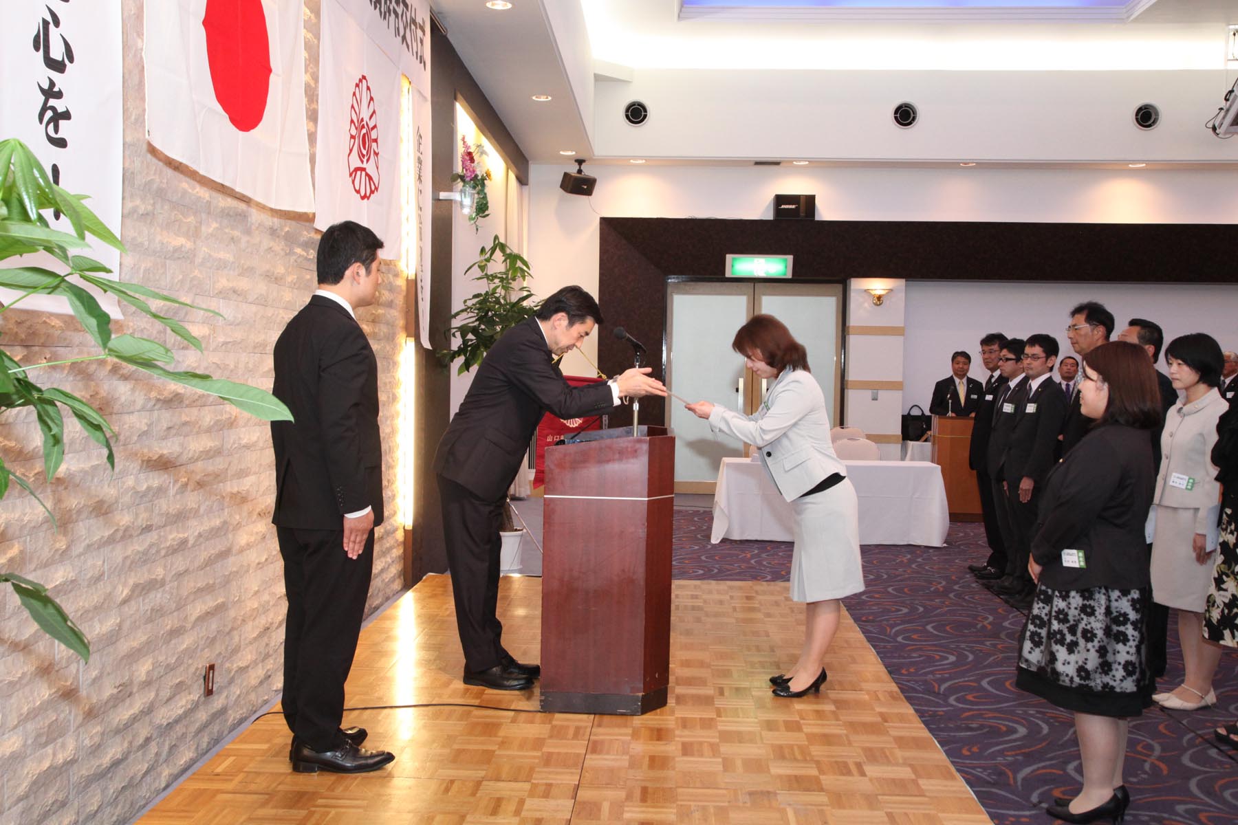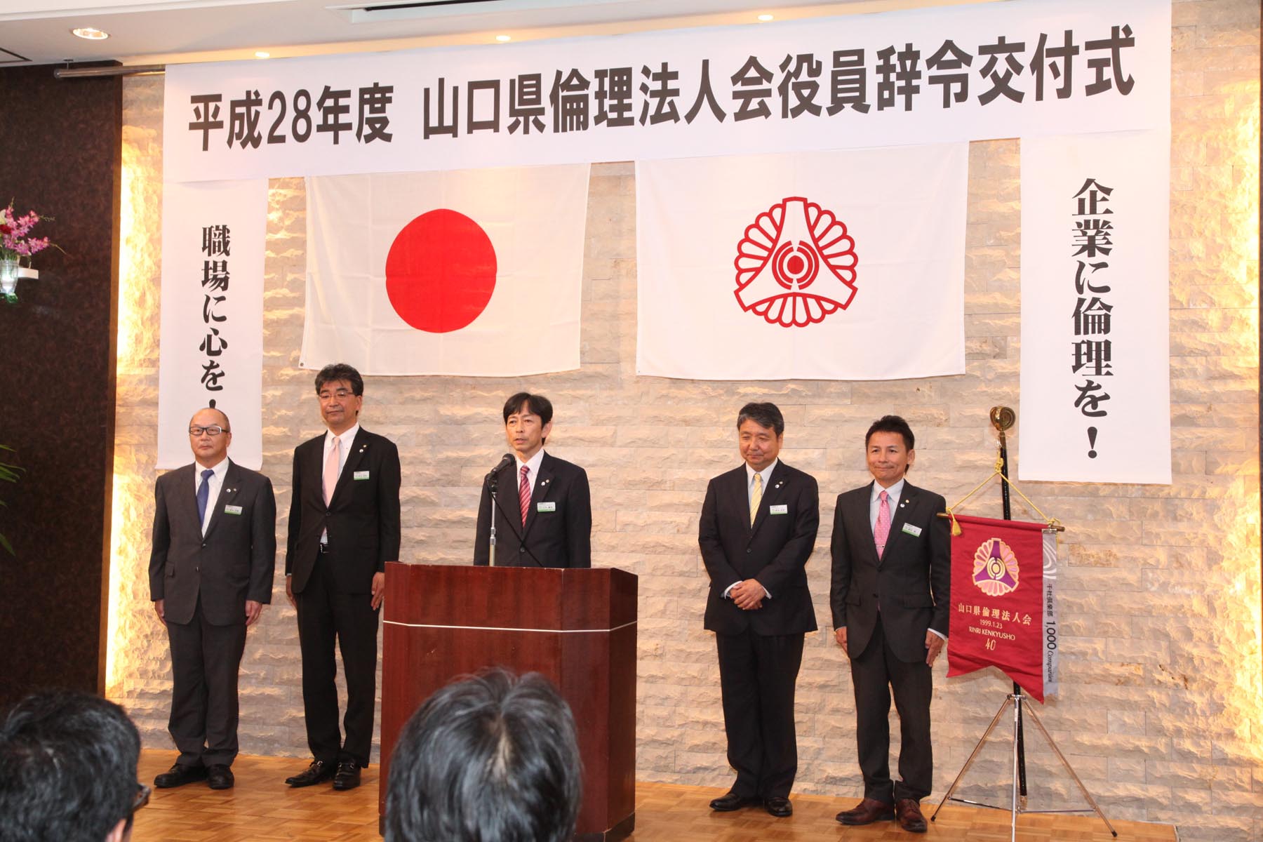 辞令交付式が行われました。 去る9月9日、光市のホテル松原屋で28年度の役員辞令交付式が執り行われました。 倫理法人会の1年間は、9月から始まり翌年の8月までです。私も山口県会長としての2年目の任期が始まったわけです。私も過去何年か何らかの辞令を受けて来たのですが、会長の辞令は本当に身が引き締まる思いです。 この日、山口県内各地から100名以上の役員の方々にお集まりいただき理事長辞令の交付を受けました。 企業に倫理を、職場に心を、家庭に愛を、の思いで会社も世の中も良くなるように頑張りましょう!