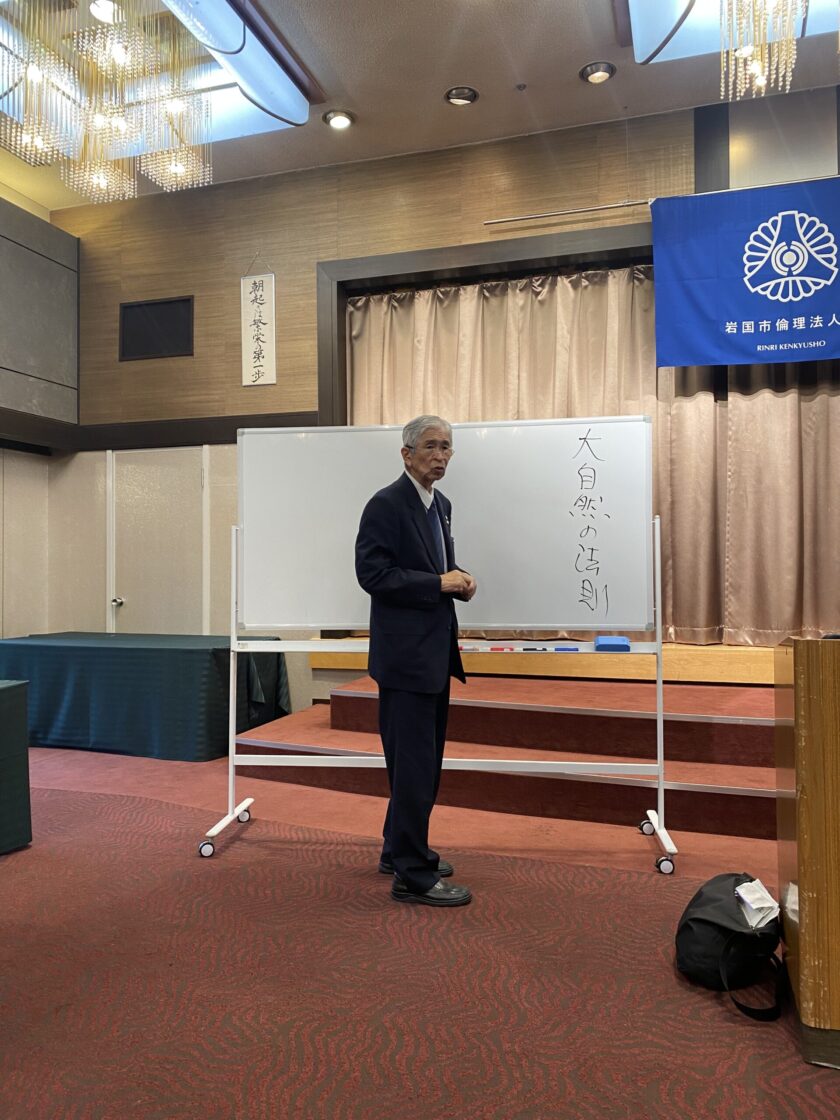 倫理経営基礎講座 講師:(一社)倫理研究所 法人アドバイザー 岡田印刷(株) アドバイザー 岡田 紀夫 氏 テーマ:第15講 地球倫理の推進 4月27日18時半より岩国市観光ホテルにて 倫理経営基礎講座が開催されました。 循環する大自然の法則について 詳しく 万人幸福の栞を用いて 道筋を丁寧に教えていただきました。 出席者数 12社でした。